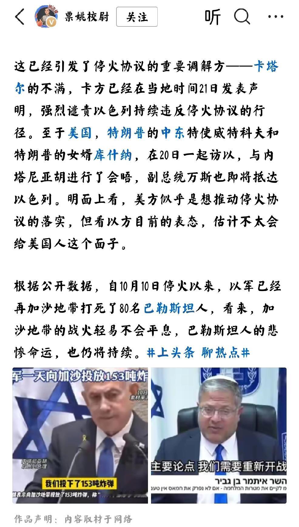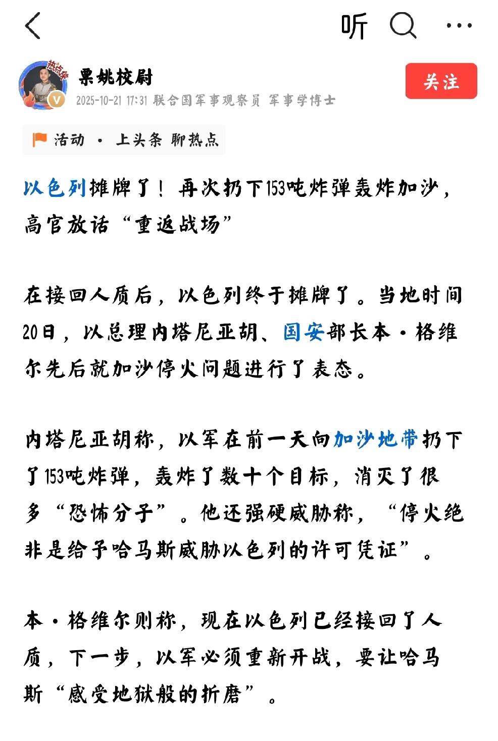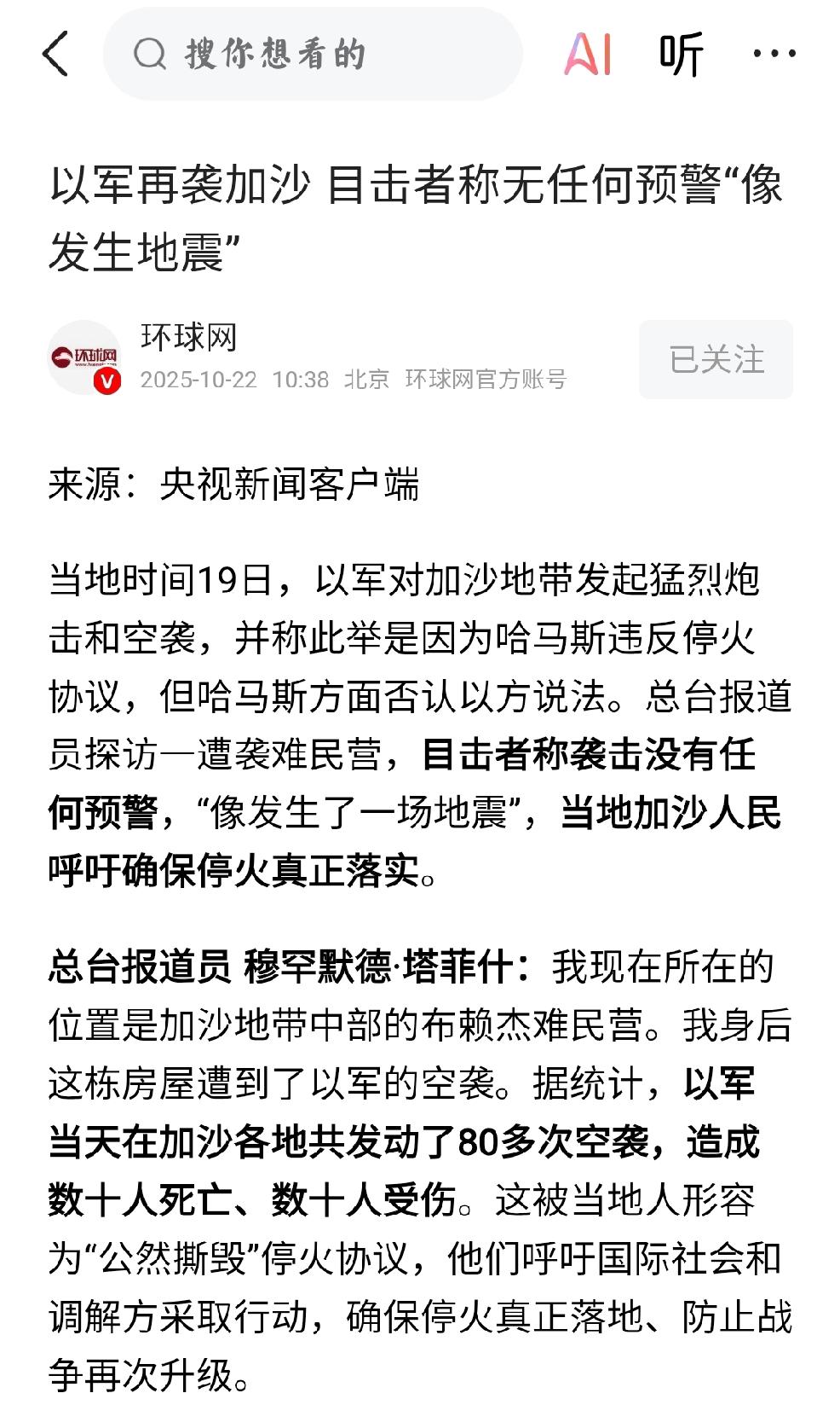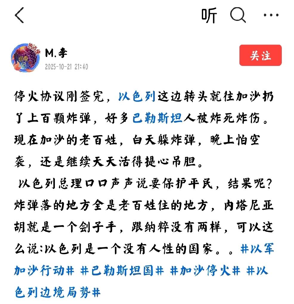 加沙重燃战火 个人观点:现在应该为加沙重燃战火做准备了。后勤物资,军备武器,民众老幼,国际援助,外交准备等等各方面不但要做准备,还要做长时间的计划。 以色列是在灭绝人性的实行种族灭绝战争,没有给加沙这个多灾多难的地方,以喘息的机会。