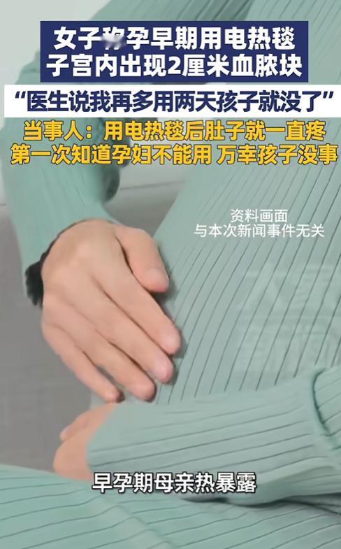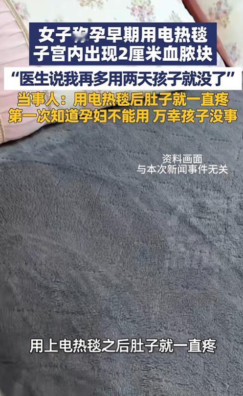 “防不胜防!”10月21日,北京,一女子孕早期使用电热毯后肚子一直疼,她来到医院检查,没想到子宫内竟然出现了一个2厘米的血脓块,罪魁祸首正是电热毯,医生表示女子要是再多用两天,孩子就保不住了!网友:我也是第一次知道! 怀孕期间有许许多多的禁忌,有些很多人甚至都不知道,孕妇如果不小心注意,很有可能造成不可挽回的后果。 天气转凉,很多地区还没有开始供暖,一孕早期女子怕冻着,拿出家中的电热毯调高温度铺在床上,没想到,用上电热毯后她的肚子就开始疼。 疼痛的症状一直没缓解,女子有些担心,急忙跑到医院检查,检查的结果让她大吃一惊,女子的子宫内竟然出现了一个2厘米的血脓块。 导致血脓块出现的罪魁祸首,竟然是电热毯,这让女子十分震惊,医生表示,如果女子再多用两天,估计孩子就保不住了! 在孕早期孕妇如果热暴露,比如蒸桑拿、热疗等高温环境,会大大增加流产的风险,电热毯不是说不能用,而是要尽量少用,并且温度一定不要调太高! 不少网友表示,自己也是刚刚知道孕早期不当使用电热毯会流产,怀孕后一定要处处谨慎,别因为自己的一时大意酿成悲剧! 信息来源:《女子称孕早期用电热毯,子宫出现2厘米血脓块》大象新闻