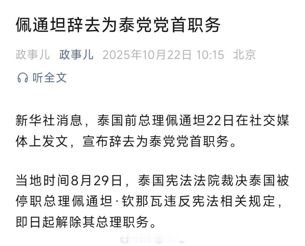佩通坦辞去为泰党党首职务!热点现场