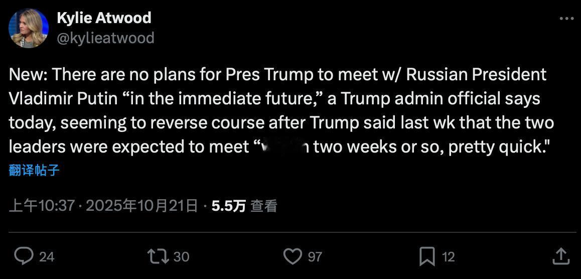 CNN记者凯莉·阿特伍德(Kylie Atwood)援引白宫官员消息称,特朗普总统近期“没有与俄罗斯总统普京会面的计划”,这一说法与他上周宣称双方“将在两周左右、很快会晤”的表态相矛盾。随后,白宫正式确认,双方原计划在布达佩斯举行的第二次面对面峰会已被取消。官员表示,此决定是在鲁比奥与俄罗斯外长拉夫罗夫通话后作出的,双方进行了“富有成效的”交流,因此“无需额外的面对面会晤”。据俄方称,拉夫罗夫在莫斯科记者会上透露,他已告知鲁比奥,俄罗斯在和平协议问题上的立场自两国领导人上次在阿拉斯加会晤以来“没有变化”。此举显示,美俄在关键议题上依旧存在分歧,双方高层接触将暂时降温。 图片来源于网络