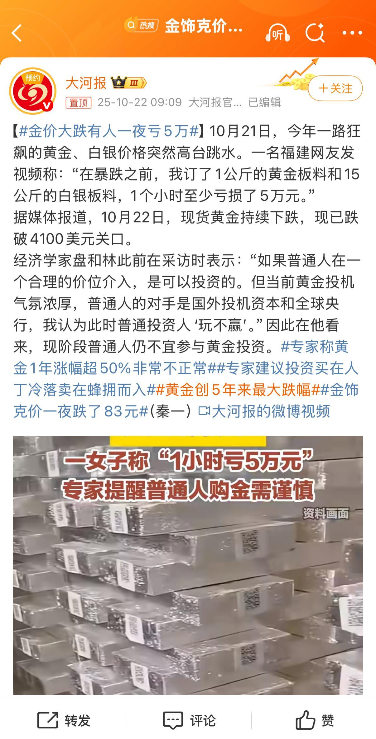 金饰克价一夜跌了83元 黄金过山车我们普通人真的还是别坐了吧[允悲]金价大跌有人一夜亏5万