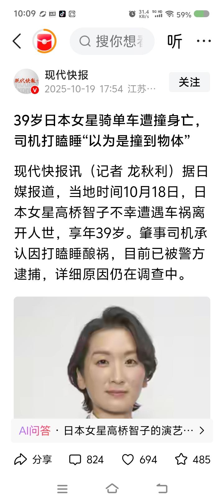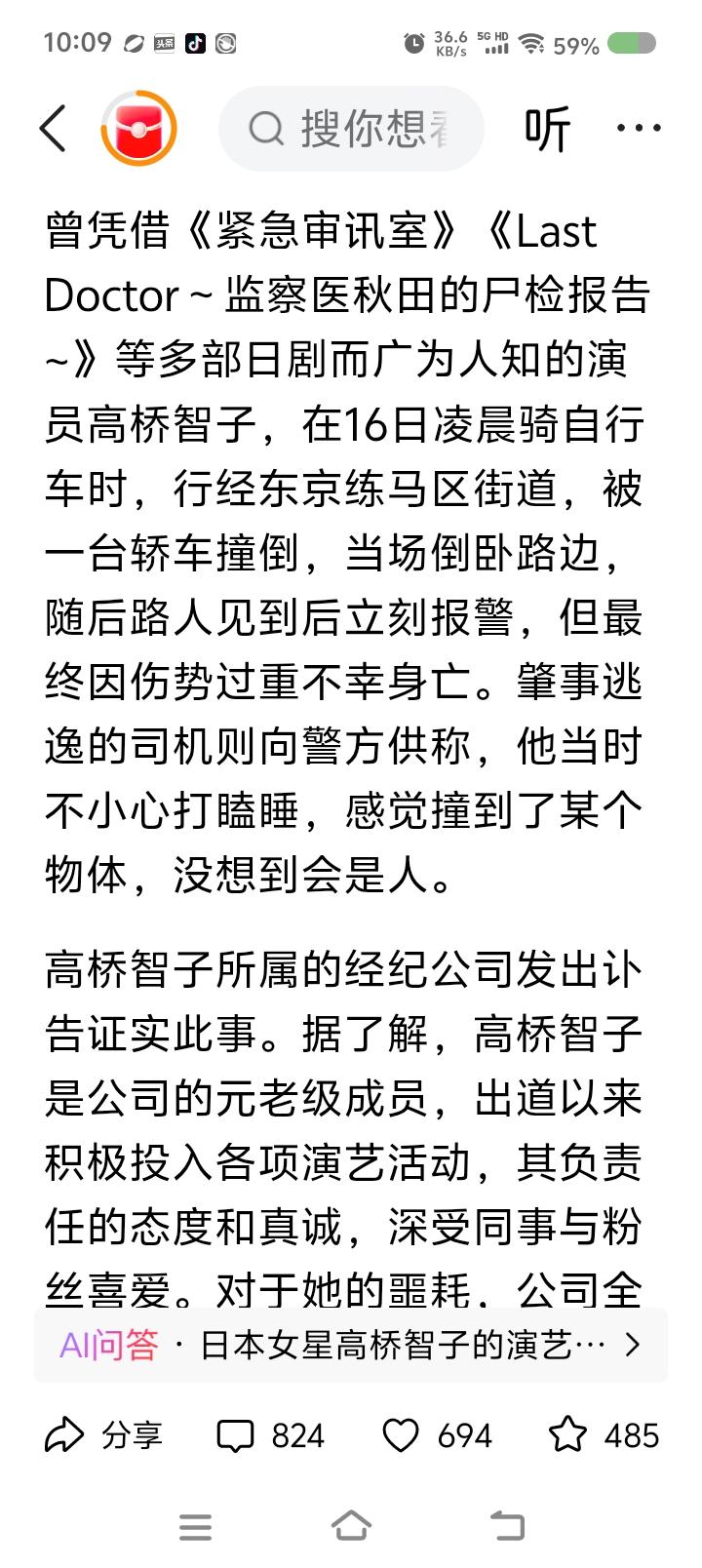 高桥智子是谁?—— 据报道,日本演员高桥智子骑自行车时遭遇车祸,不幸离世。