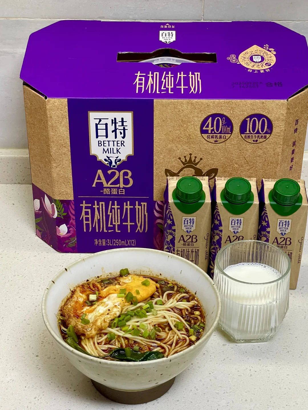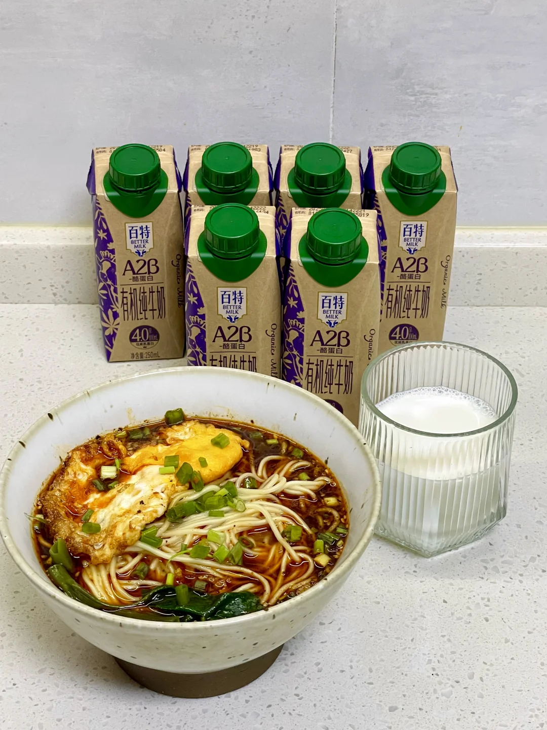 川渝打工人的标配,一碗重庆小面➕一杯百特有机纯牛奶,营养又管饱