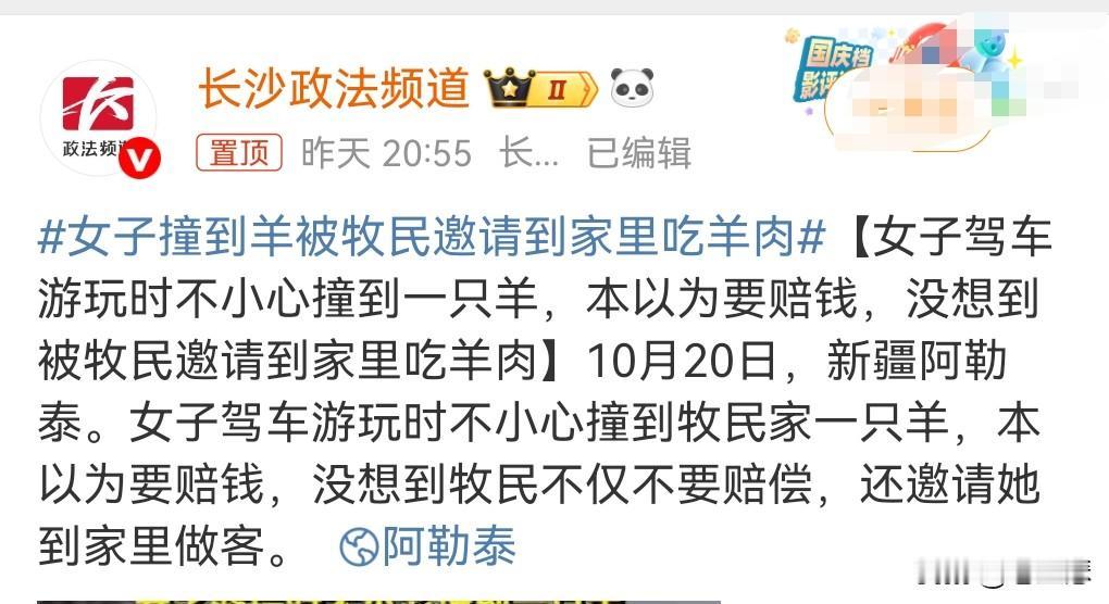 希望不是剧本。 网传视频显示。 10月20日,女子撞到羊被牧民邀请到家里吃羊肉。 本以为要赔钱,羊骨折了,主人说养不活了。 结果主人不仅不要女子赔钱,还把女子邀请到家里面吃羊肉。 这新疆大哥也太好了吧。