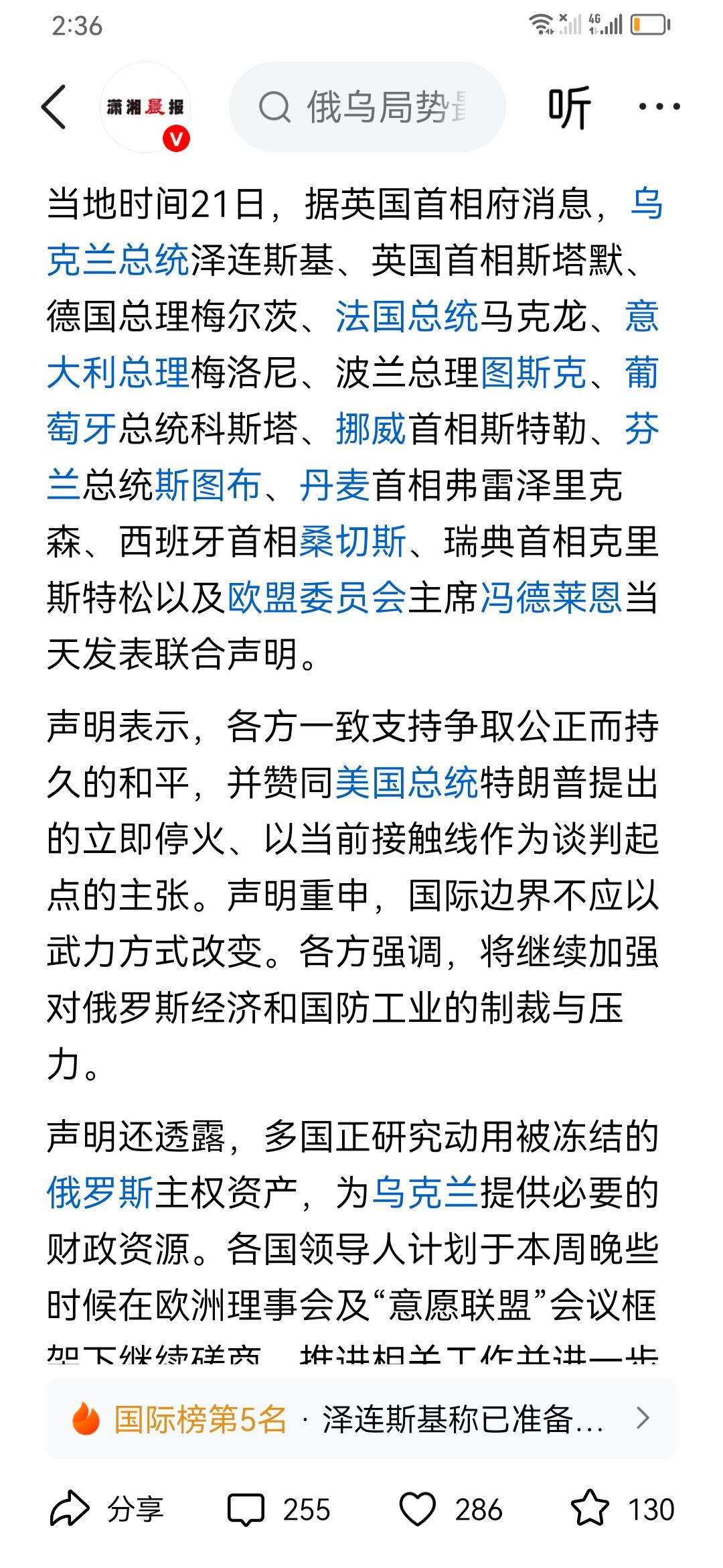 欧洲各国一致同意美国川普关于俄乌停战的建议,以俄乌当前接触线为谈判起点进行交涉。泽连斯基也同意了。 俄乌战争打了3年,双方也都耗不起了。 俄罗斯己有朝军\古巴军加入,经济压力加大。 乌克兰河山破碎,死伤数字日益增加。 欧洲为支持乌克兰出力又出人,也不知道战争前途如何。肉眼可见地是失去了俄罗斯能源,冬天来临,无薪取暖。 面对俄罗斯的坚强决心,也许美西方考虑让出乌东之地。 此地本为俄罗斯人传统地方。 只在苏联时代分给了乌克兰。 现在的俄罗斯虽有军力,有资源,经济上不行,已成为二流之国。 再坚持俄乌之战,只会把俄罗斯进一步推向东方。 这个大结局美西不愿看到。 只是要委屈了乌克兰与泽连斯基。 晚些时候,川普将与普京在匈牙利会商。