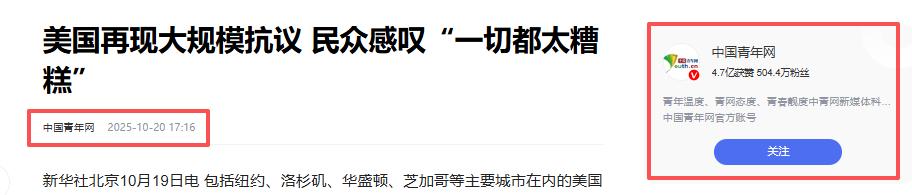 美国的天彻底塌了!当地时间10月18日这一天,全美50个州跟被按了统一开关似的,到处都是举着牌子喊口号的抗议人群! 10 月 18 号这天,美国从东海岸的纽约到西海岸的洛杉矶,到处都是抗议的人群,50 个州就像被统一安排了一样,同步爆发了示威活动。组织者说,这次参与的人有 700 万,遍布 2700 多个城镇,不管是大城市还是小乡镇,都能看到举着牌子喊口号的民众,这是美国今年规模最大的一次全国性抗议。 在纽约,超过 10 万人挤在曼哈顿的时报广场,手里举着 “宪法不是可有可无”“美国移民与海关执法局离开街头” 的牌子,后来还慢慢往曼哈顿下城游行,直到下午才解散,警方也没抓人。 国会里的民主党领袖查克・舒默也去了纽约的抗议现场,跟着大家一起反对共和党削减医保资金的政策。加利福尼亚州的圣迭戈更热闹,一开始几千人在市政厅前聚集,后来沿着警方划的路线走到海边,一路上不断有人加入,最后海边聚了 2.5 万人。他们举的标语里写着 “关税是对我们征税”“要社会福利,不要富豪减税”,看得出来对经济政策意见很大。 为啥这么多人愿意放下手头的事上街?根本还是日子不好过,政策让人没法忍。先说移民的事,这是很多人抗议的主要原因。 圣迭戈那边的拉丁裔居民反应最强烈,有个叫西尔维娅・格罗瓦兹的女士说,她家是墨西哥来的,虽然已经是美国公民,但总担心被移民局的蒙面执法人员随便抓走,就因为自己的肤色或者说西班牙语。 当地媒体统计,从今年 2 月到现在,圣迭戈已经有 1800 多人被移民执法部门抓了,是去年同期的 3 倍,这里面还有不少合法居留的人,这让移民社区的人都很恐慌。 经济压力更是实实在在的。曼哈顿有个居民戴维・卡波尼亚说,现在美国的农产品卖不出去,农民都快破产了,物价还一个劲涨。 本来该用在医疗补助和医保上的钱,也被挪去干别的了。芝加哥一个有两个孩子的妈妈金托也担心,医保资金被削减后,孩子们看病成问题,生活成本还得往上走。最新的民调显示,特朗普在经济政策上的支持率降到了 44%,是他任职以来最低的,有 53% 的人觉得政府停摆带来的经济冲击得算在他和共和党头上。 说到政府停摆,这已经持续快 20 天了,大量公务员拿不到工资,公共服务都瘫痪了。食品药品监督管理局的安东尼・李被迫休假,他说自己当了 20 多年公务员,看着政府和公共服务被搞成这样,心里特别害怕,所以一定要来抗议。 更严重的是,核安局有 1400 人没工资休假,这可是管核武器安全的部门,这么多人不上岗太危险了。国防部为了给军人发工资,还挪用了 80 亿军事研发经费,短期能填窟窿,长期肯定影响军事科技发展。 让人没想到的是,面对这么大的抗议浪潮,特朗普的回应反而火上浇油。他在自己的社交平台发了段 AI 做的视频,里面自己戴着王冠,开着写着 “特朗普国王” 的战机,往示威者头上空投粪便,还用了电影《壮志凌云》的背景音乐。副总统万斯也发了段 AI 视频,里面民主党人对着 “特朗普国王” 下跪。 网友看了都炸了,有人说他简直疯了,必须下台,还有人说这视频正好说明大家抗议是对的。更讽刺的是,特朗普自己躲去了佛罗里达的海湖庄园,可就连庄园外都聚了几百个抗议的人,他也没敢公开露面。 其实这不是第一次抗议了,今年 6 月 14 号就有过一次 “不要国王” 的抗议,当时也是反对移民、卫生、教育方面的政策。这次的抗议是上次的延续,只不过更聚焦民生诉求,针对性更强。 新泽西州一个退休工程师马斯科利说,他老家是意大利的,没想到在美国能看到类似法西斯的苗头,所以一定要来抗议。华盛顿的朗费尔特则不满政府越权,觉得国会也不管事,这样下去不行。 这场抗议还引起了国际关注,柏林、巴黎、罗马的人在美国大使馆外声援,加拿大多伦多的示威者还举着 “别碰加拿大” 的标语。 大家都看出来,美国的政策不光影响自己人,还波及到了其他国家。现在抗议人群虽然散了,但问题根本没解决,纽约时报广场的标语没了,可大家的不满还在。离 11 月的中期选举越来越近,700 万人的声音占了美国成年人口的 3.5%,这么大的民意肯定会影响选举走向,接下来美国的政治还得乱一阵子。
