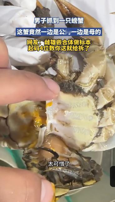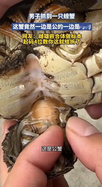 “活久见!”10月20日,江苏,一男子抓到了一只的“阴阳蟹”,这只螃蟹竟然一边是公的,一边是母的,他直接将螃蟹带回家煮了吃,网友:雌雄同体,想吃膏有膏,想吃黄有黄! 分辨螃蟹公母的方法有很多种,最常见的就是看螃蟹腹部蟹脐,圆脐是母,尖脐是公,可你知道吗,这世界上居然还存在着“半公半母”的螃蟹! 一男子抓螃蟹时发现了一只特别的螃蟹,他捡起来仔细查看,有些不可置信,这只螃蟹一边有公蟹的特征,另一边看起来却像是母蟹,两边的蟹爪也有所不同,正是所谓的雌雄同体。 可惜的是,在男子发现这只“阴阳蟹”时它已经死了,本着不浪费的原则,他将其带回了家,和其他的螃蟹一起蒸来吃掉,煮熟的“阴阳蟹”看起来十分诱人,男子大快朵颐。 男子将自己捡到“阴阳蟹”的经历分享到了网上,有人表示这属于螃蟹雌雄嵌合体,如果做成标本起码能卖到四位数,男子居然就这样吃到肚子里,简直是暴殄天物! 不少网友觉得男子十分幸运,这样“半公半母”的螃蟹十分罕见,估计身体里应该同时有膏又有黄,不管做成标本到底能不能卖出高价格,至少男子是饱口福了! 信息来源:《男子抓到一只螃蟹,这蟹竟然一边是公的一边是母的》云观视角