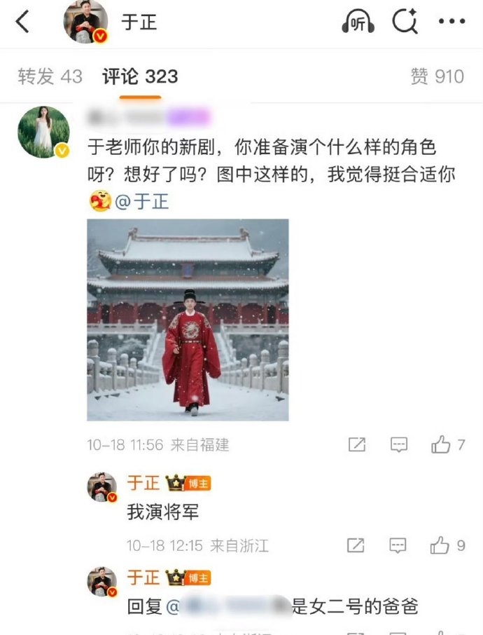于正说将在新剧里饰演一位将军,是女二号的爸爸,看看是不是真的