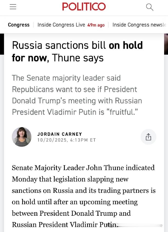 特朗普不仅没有向乌克兰提供“战斧”巡航导弹,也暂停了对俄制裁,稍早些,美国参议院多数党领袖、共和党领袖约翰·图恩表示,关于对俄罗斯制裁新法案的讨论已经停止,相关工作将在双普会晤后继续,现在,双普会晤已经取消,该怎么办?