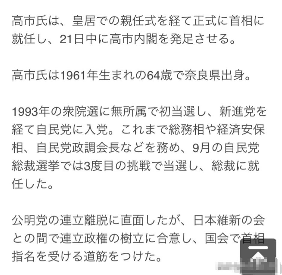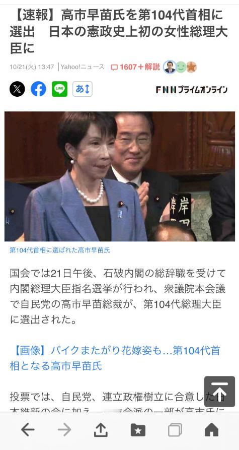 在刚刚进行的众议院全体会议上,高市早苗以过半的票数被确认为日本第104位首相。也