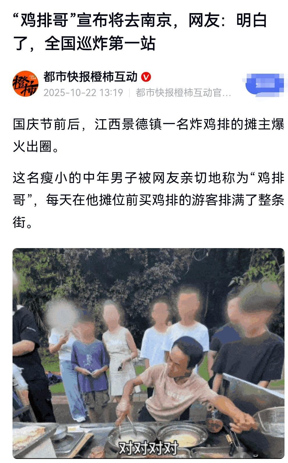 这年头出名要趁早啊。 鸡排哥趁着流量还在的时候,决定进行全国巡炸。 10月22日在网上看到这么个消息。 鸡排哥将去南京,全国巡炸第一站。 之所以选在南京,是因为那里有要举办一个音乐节。 这倒是非常的有眼光。 网友们都很期待鸡排哥来到他们所在的城市摆摊。 这些网友们很捧场啊。鸡排哥将去南京 全国巡炸第一站