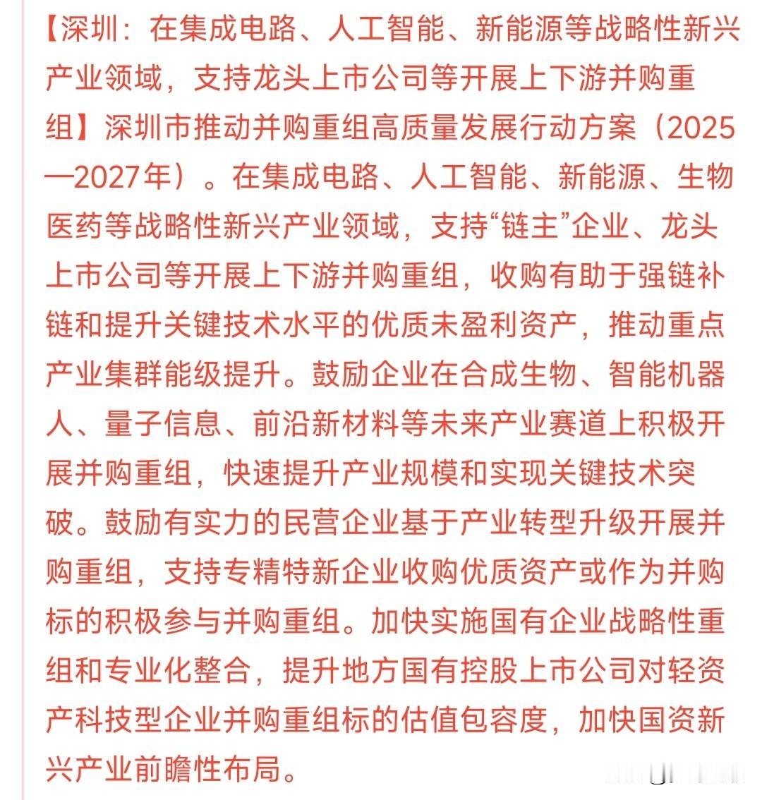 并购重组的消息又来了,明天深圳上市公司又要爆了 政策面再次提倡并购重组了,而且这次着重提到的是新兴产业,包括新能源,人工智能核集成电路等行业,可以肯定的是并购后会出现大市值公司,对于这些公司在行业内将会更有竞争力。 而且并购重组能够摒除落后产能,先进产能能够大幅提升,公司业绩会上升。 最重要的是这次定下了目标,到2027年会有20万亿的总市值,现在深圳境内外上市公司是12万亿,也就是说还有8万亿的空间,这将是一个庞大的目标,明天深圳地区上市公司又要爆了。