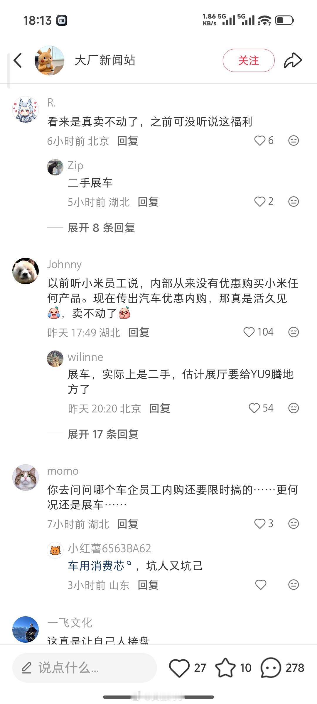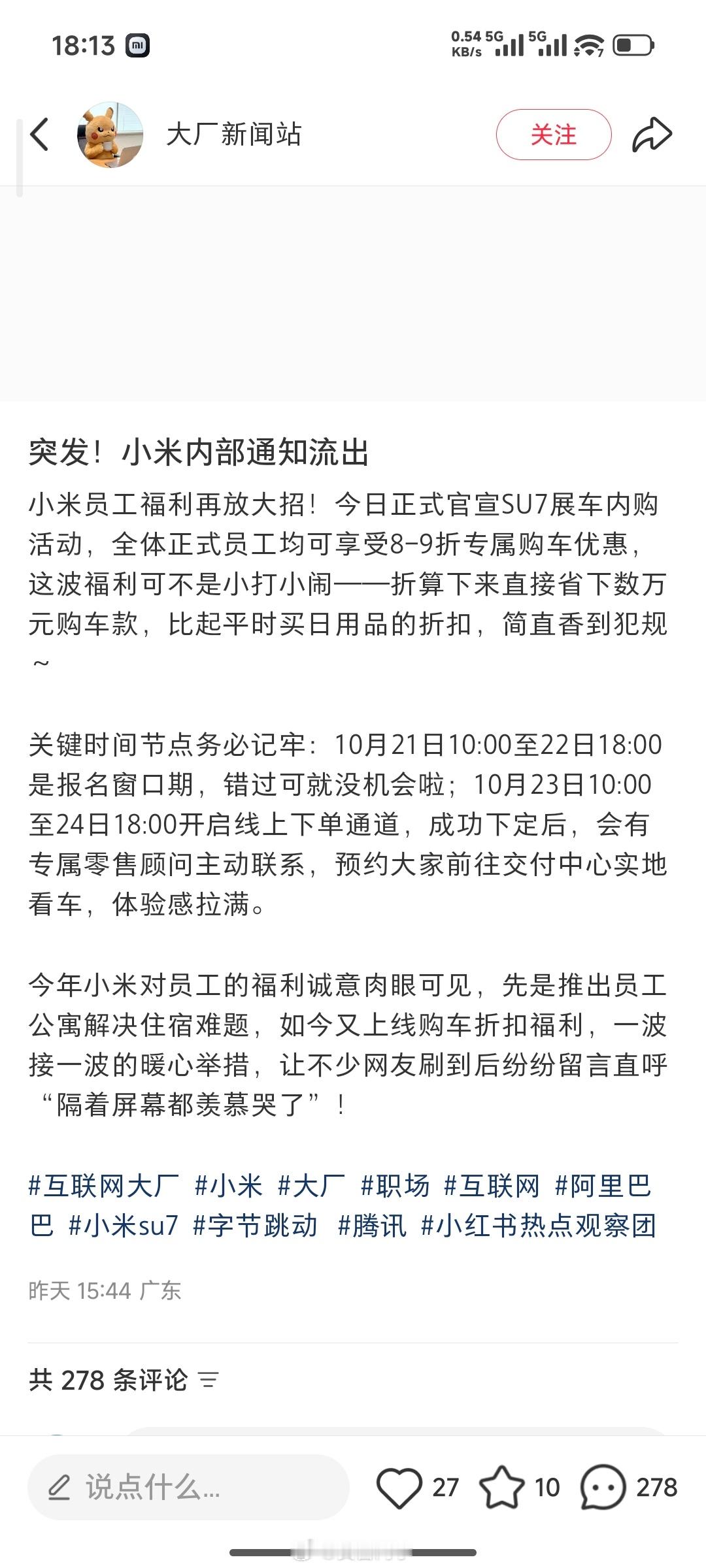 刷到一个小米员工内购SU7展车的帖子,小米展车员工内购有 8-9 折的优惠。