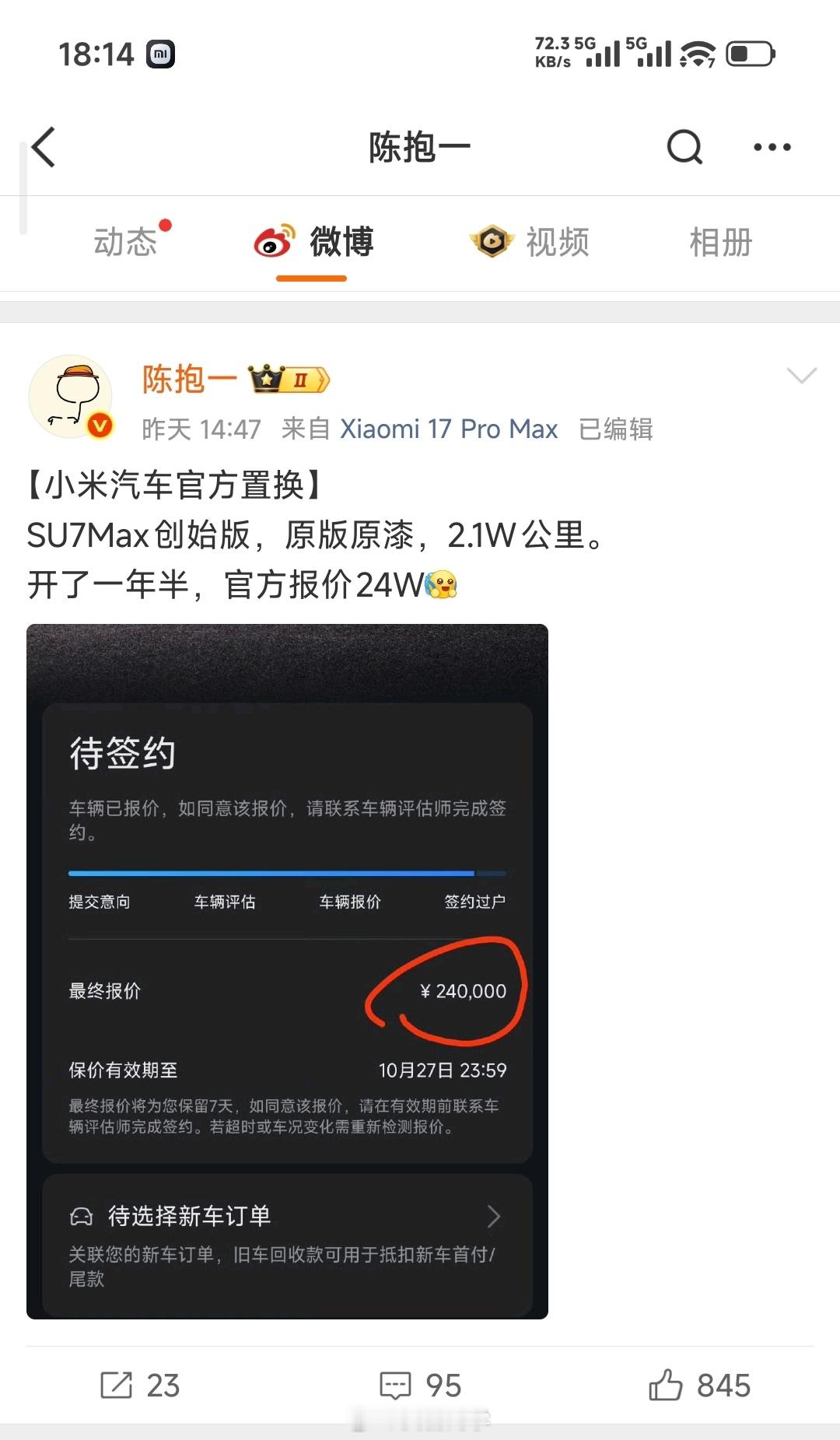 再就是昨天抱一同学也发了一个帖子,他的小米 SU7 Max,2.1 万公里了,一年半的车子了,现在小米回收还给了 8 折的价格。