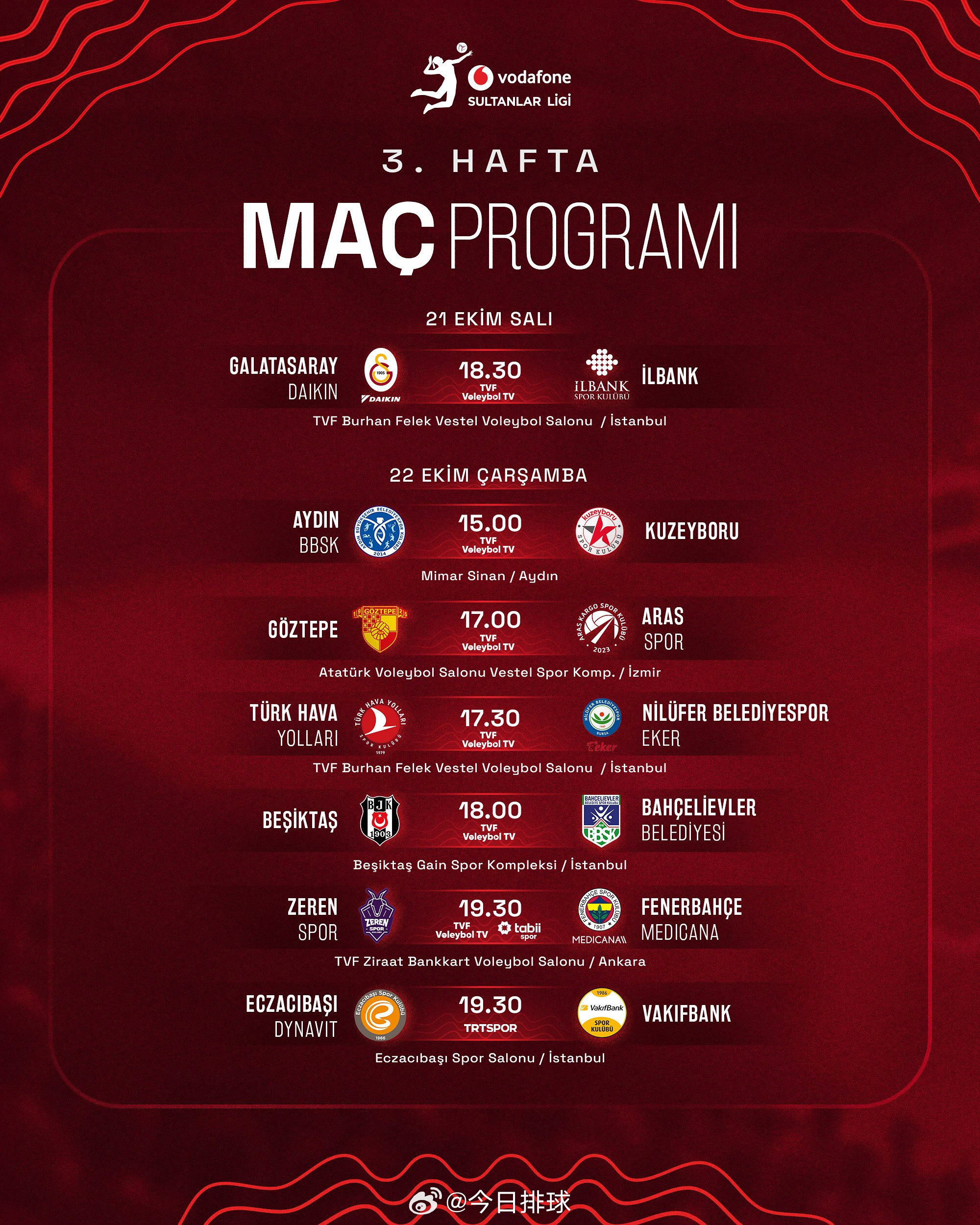 2025-2026女排土超 常规赛第3轮竞赛日程,北京时间明天凌晨00:30,伊萨奇巴希将迎战瓦基弗银行。