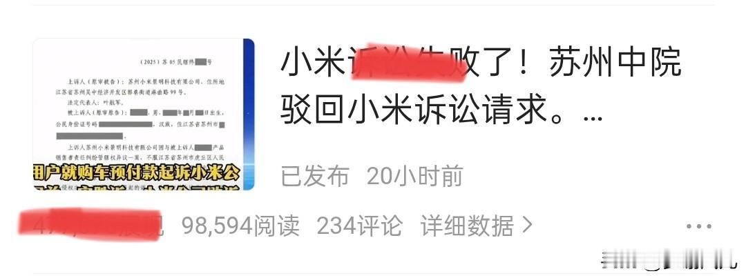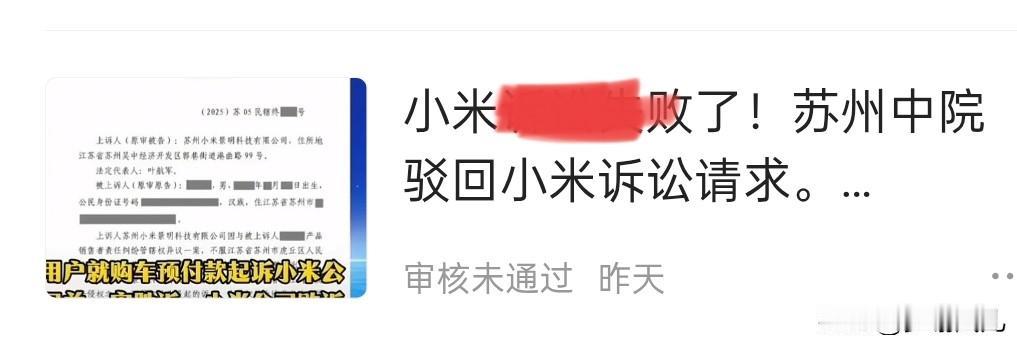 被小米投诉下架了!昨天写了一篇微头条,内容大致是说:一小米购车用户因为su7ultra碳纤维车盖的事向法院起诉,要求小米退预付款,之后苏州中院驳回了小米的管辖权异议,就此事我想小米没考虑退预付款,可能是出于怕开了先河,有人有样学样,会起了不好的头,此外可能就是怕一旦败诉,会成为被攻击的黑点;然后我想小米造车延续了手机营销的成功经验,导致了汽车宣传因用语未足够谨慎出现了漏洞,从而导致了舆论反噬;最后总结说作为任何一家企业而言,都要以技术为核心,加强技术研发,提高产品质量,才能走得更长远,不会落人口实。这篇内容到中午的时候,阅读量破了10万。等我吃完饭,打开手机内容看不到了,一看小米是被小米投诉了。 我觉得内容本身是客观公正的,但为什么被小米投诉了呢,冤不冤呢,说冤也冤,冤的是我内容不偏不倚,没有杜撰与乱说;不冤的是,我开头用了“败诉”两个字,这对法律文件解读出现了不严谨,不应该用败诉,而应该说将管辖权异议申请失败了,再就是配图里面我应该截原主晒出的裁定书出具的图,而不应该用加了文字的网图,这都是不严谨,引起了一些误解。 以下括号内容为小米举报我的微头条内容描述:(该内容为民事裁定,并非民事判决, 内容中所述的“一审胜诉”为不实信 该裁定内容实际情况为基层人 息。 民法院驳回我方提出的管辖权异议 后,我方向中级人民法院提出了上 诉,中级法院出具该裁定,认定维持 基层法院驳回的正当性,确定了案件 审理的归属法院,但案件本身尚未开 不存在任何的一审判决,更不存 在‘一审胜诉’。”) 个人觉得这描述没问题,也算是给我普了法。经过这件事,我告诫自己以后在用词用字上一定要谨慎些,否则容易被诟病,也友情提醒大家,文字有时候不能随意,说者无心,可能听者有意了!