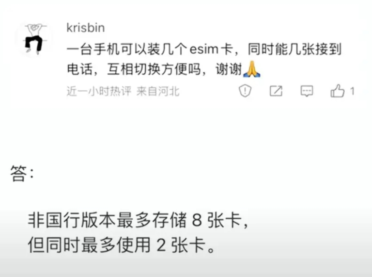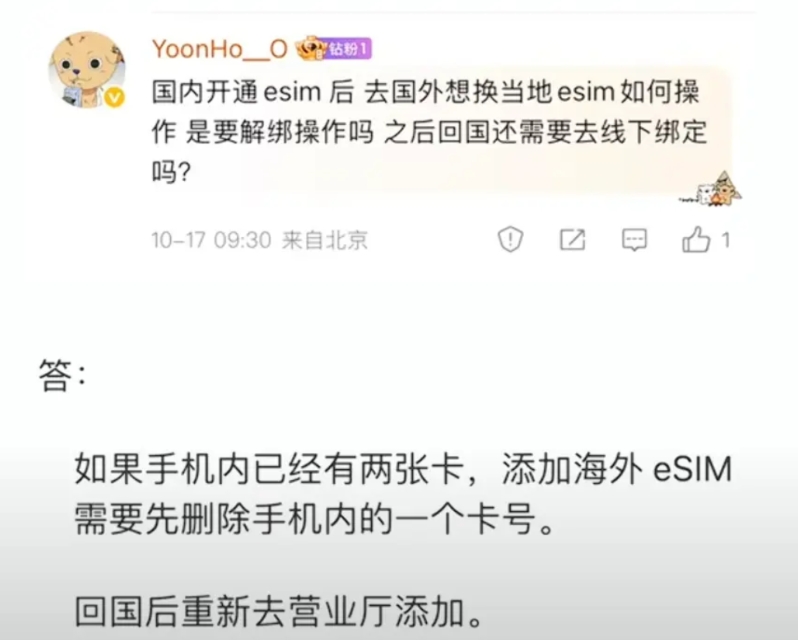 倘若手机里已写入两张eSIM卡,最好备上一台备用机。尤其是出国时,还得删除一张卡,回国后还得跑一趟营业厅,实在折腾,哪怕营业厅就在你家楼下。