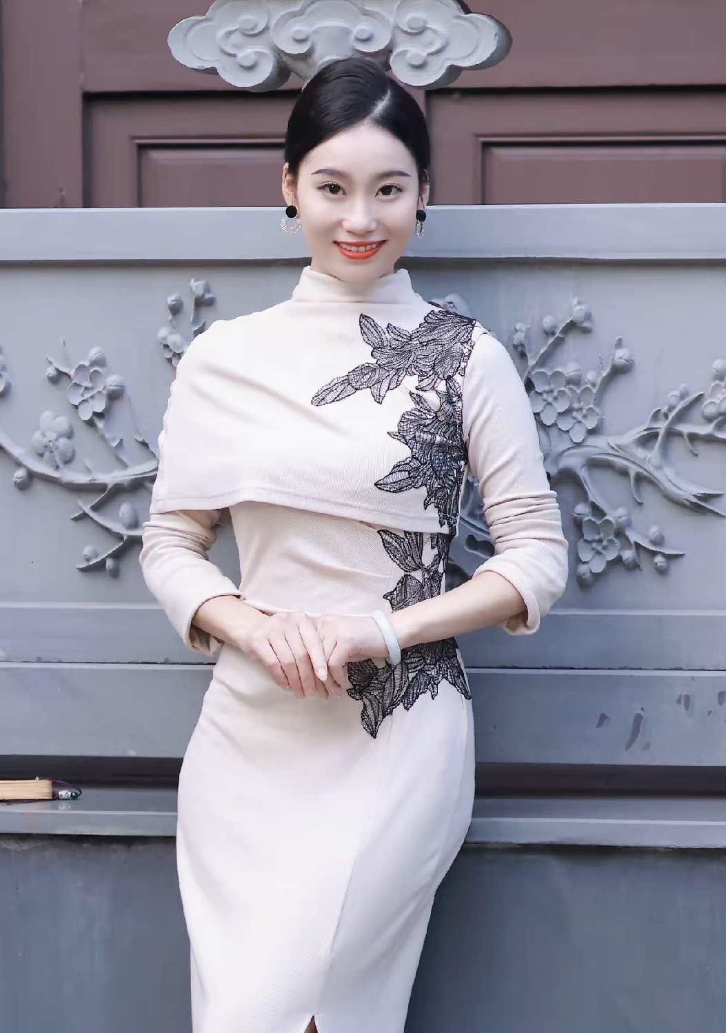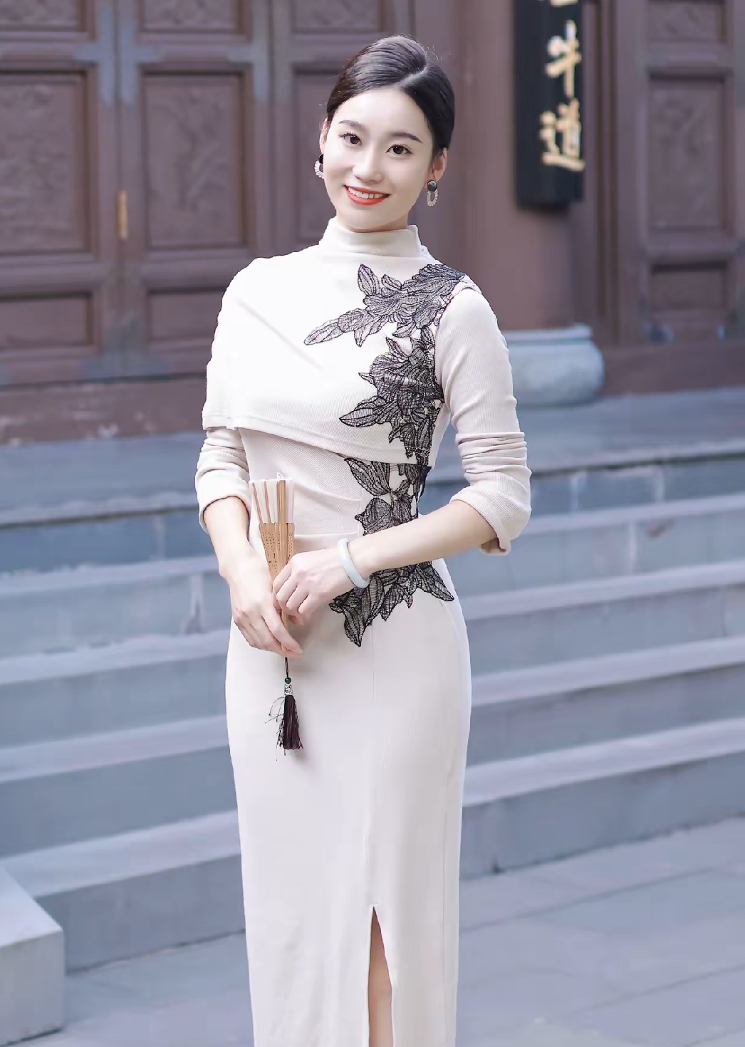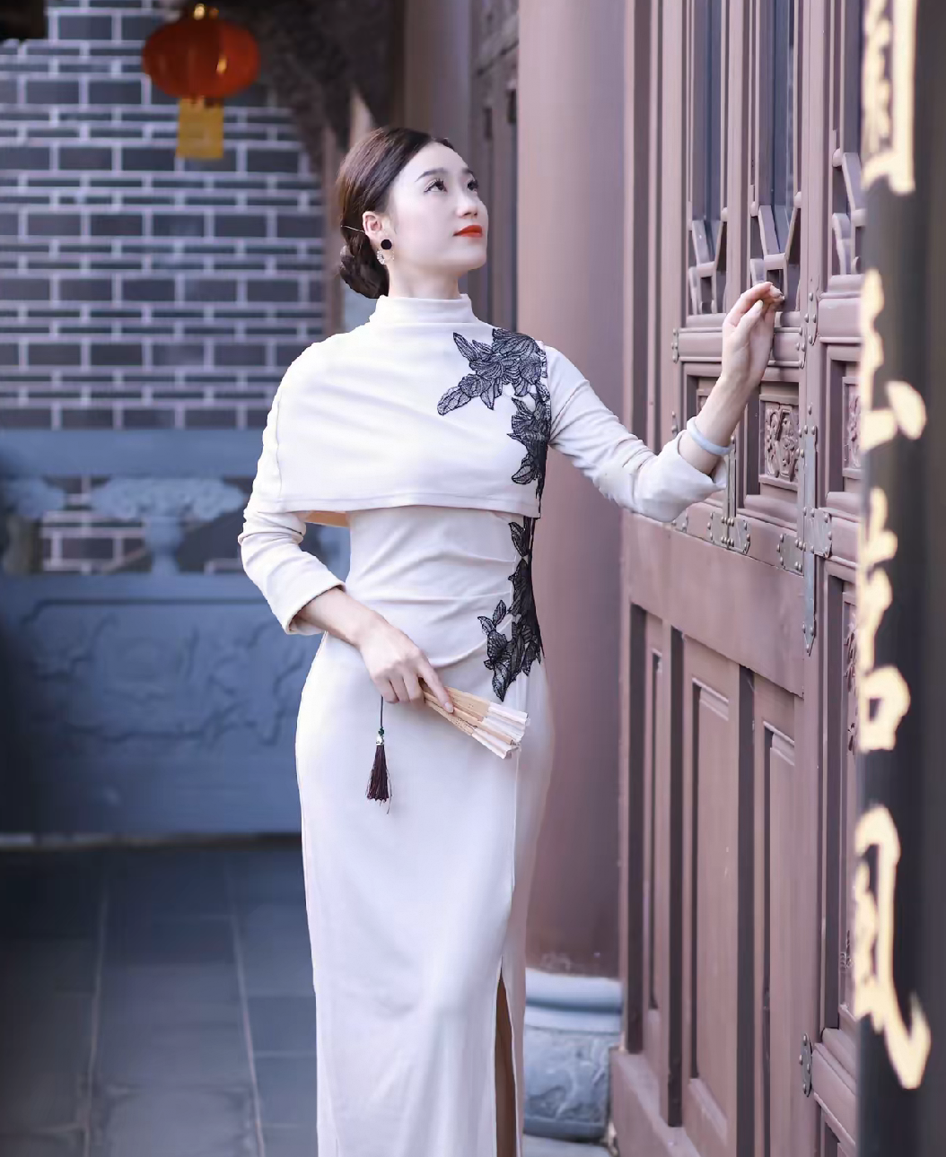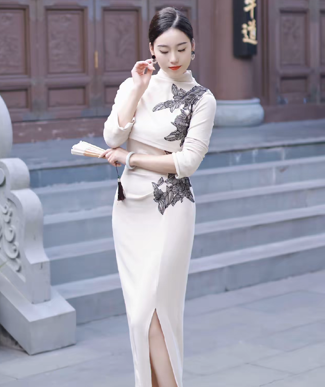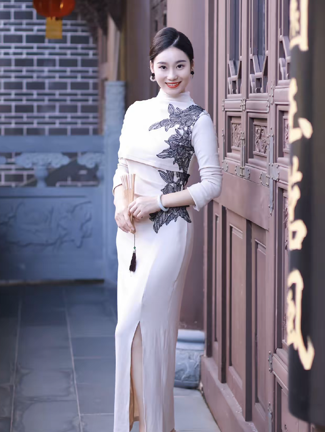 在古色古香的建筑前,一袭独特的改良旗袍,尽显东方女性的温婉与典雅。 这件旗袍以纯净的米白色为底色,如宣纸般素雅,给人宁静柔和之感。肩部与腰间精致的黑色刺绣,似墨韵在宣纸上晕染,勾勒出花朵与枝叶的轮廓,针法细腻,栩栩如生,为旗袍增添了层次感与艺术气息。高领设计延续了传统旗袍的端庄,衬托出颈部的修长。长袖款式在保暖之余,也多了几分含蓄之美。 旗袍修身的剪裁贴合身形,勾勒出曼妙身姿,开叉设计则在行走间若隐若现地露出腿部线条,于优雅中融入一丝灵动。搭配的精致耳饰与腕间玉镯,简约而不失华贵,手中的折扇轻摇,古韵悠然。 当身着这件旗袍置身于传统建筑之中,人与景相融,仿佛穿越时光,既展现了传统服饰的魅力,又诠释了现代时尚对东方美学的全新演绎 。