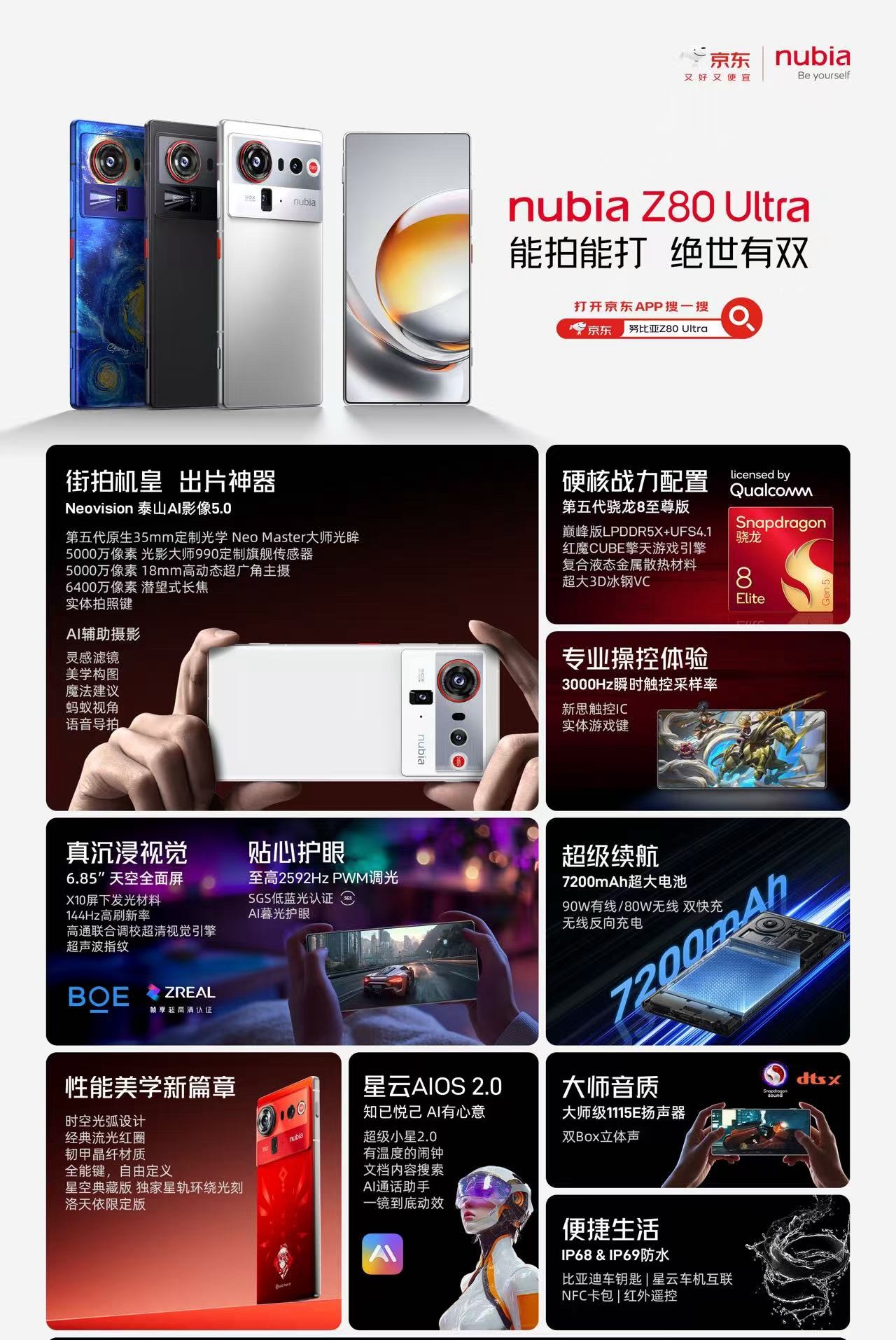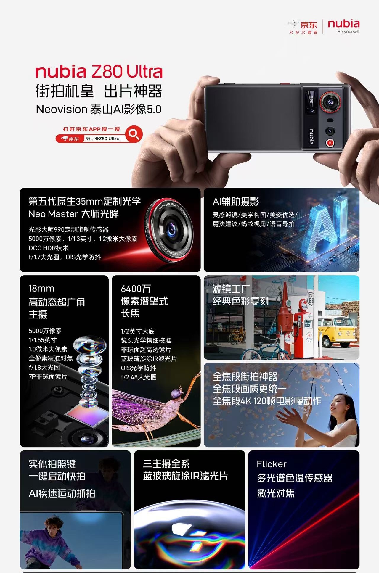 努比亚Z80 Ultra 发布了,不仅承袭卓越影像基因,更首次注入红魔游戏引擎,跨界融合,实力拉满。影像搭载5000万像素35mm人文主摄(“光影大师990”定制传感器),5000万像素超大底超广角镜头 (OV50E传感器)+6400万像素高素质潜望式长焦镜头 (OV64B传感器),覆盖全焦段创作需求,还有实体机械快门键搭配复古外观设计。