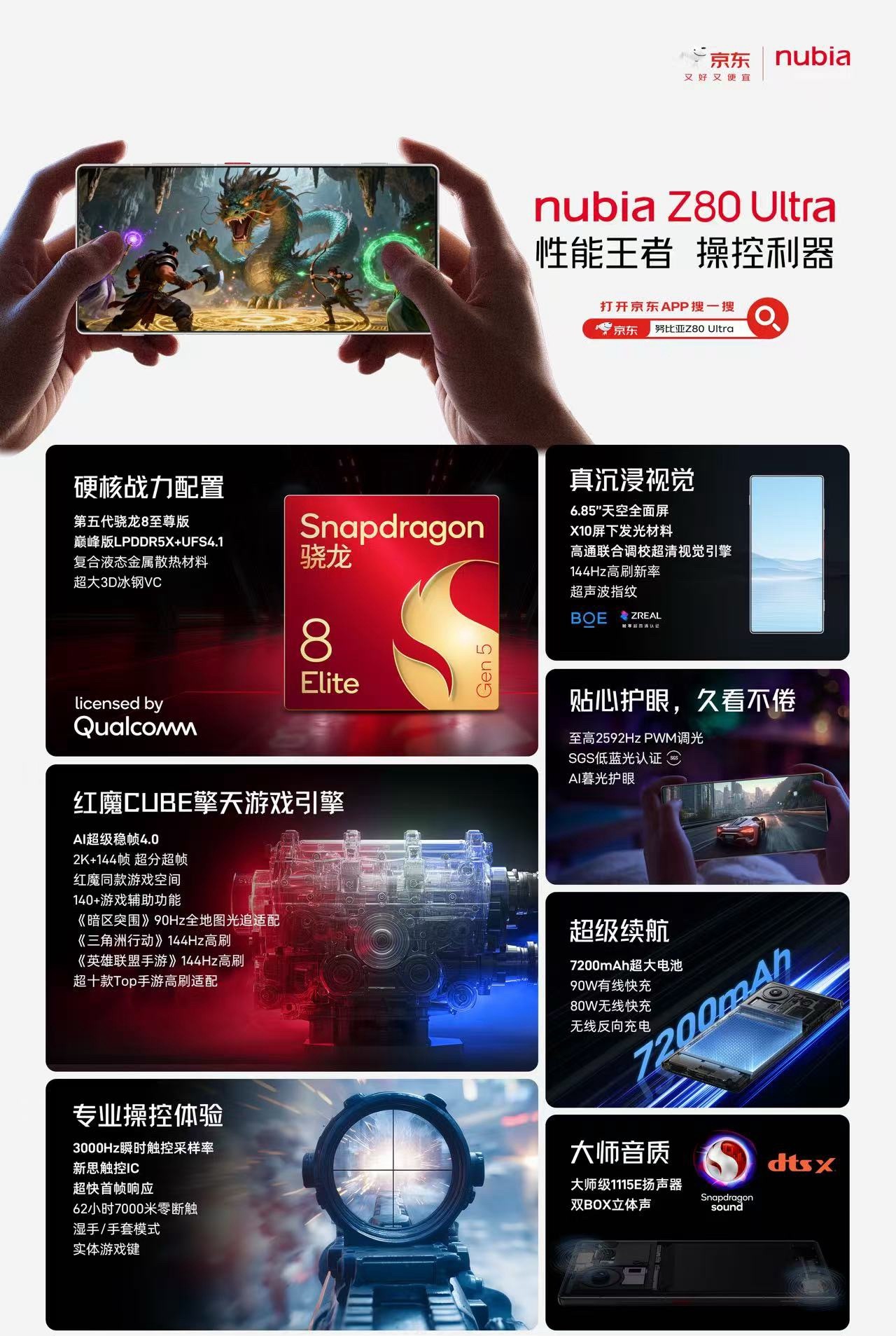 性能搭载第五代骁龙8至尊版处理器,配合LPDDR5X内存 + UFS 4.1闪存,奠定顶级性能基石。首次引入红魔游戏引擎,游戏表现更稳定强悍,最高可实现2K分辨率与144Hz刷新率同步运行的超分超帧体验。 配备超大面积VC均热板被动散热系统。
