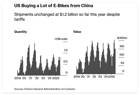 除了《纽约时报》记者的实地探访,美国彭博社在22日发布的一篇报道中,通过挖掘和呈现中美间的贸易数据指出,尽管美国政府在限制中国的商品,但中国仍然是美国大量商品供应链中的重要一环,而且这些商品并不只是关键矿物和化学品,还有诸如电动自行车等生活品。