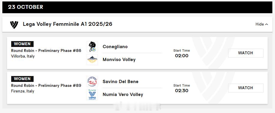 2025-2026女排意甲 常规赛第13轮的两场提前的比赛(北京时间)。
