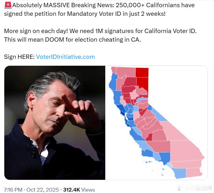 短短两周内,已有超过25万名加州居民签署了“强制选民身份证”请愿书!
