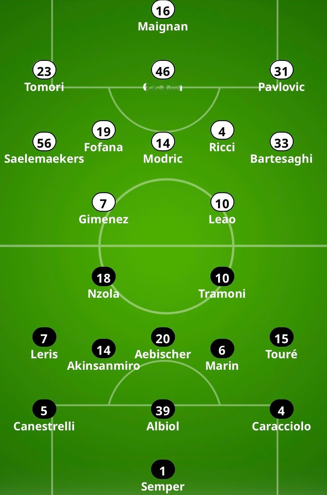 【米体】该媒体给出的2025-26赛季意甲联赛 第八轮 -🔴⚫️米兰主场对阵比萨队「预计首发阵容」第①版本(352):