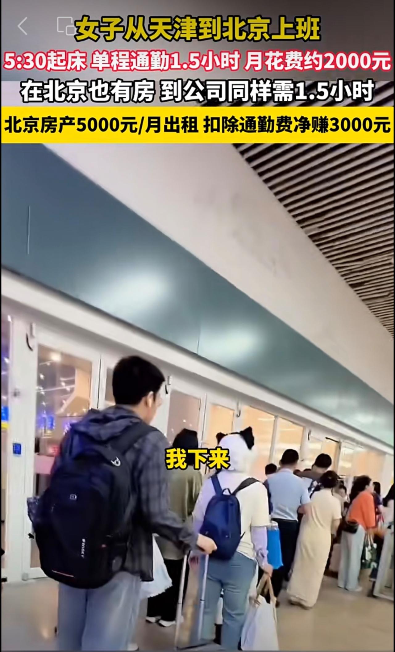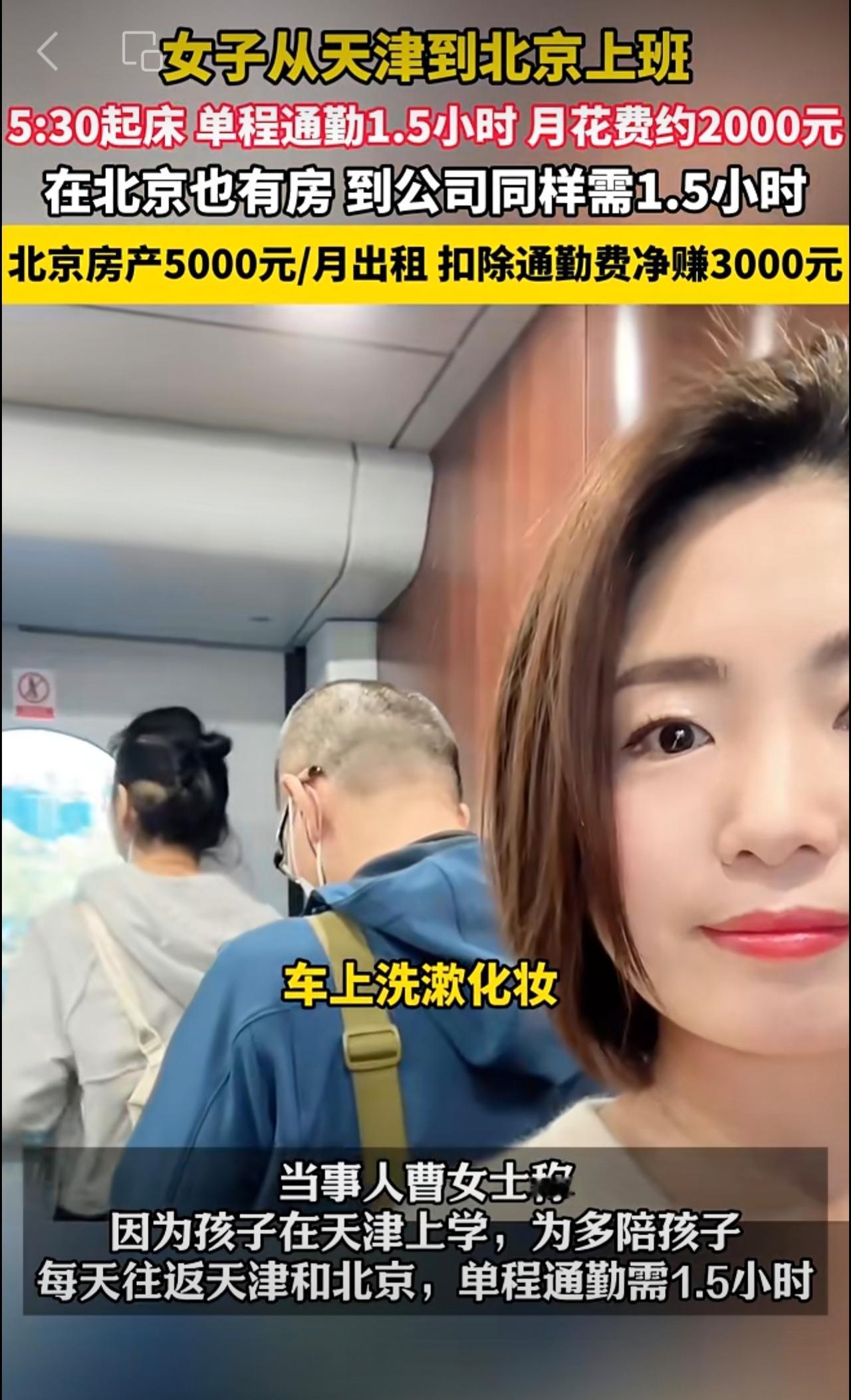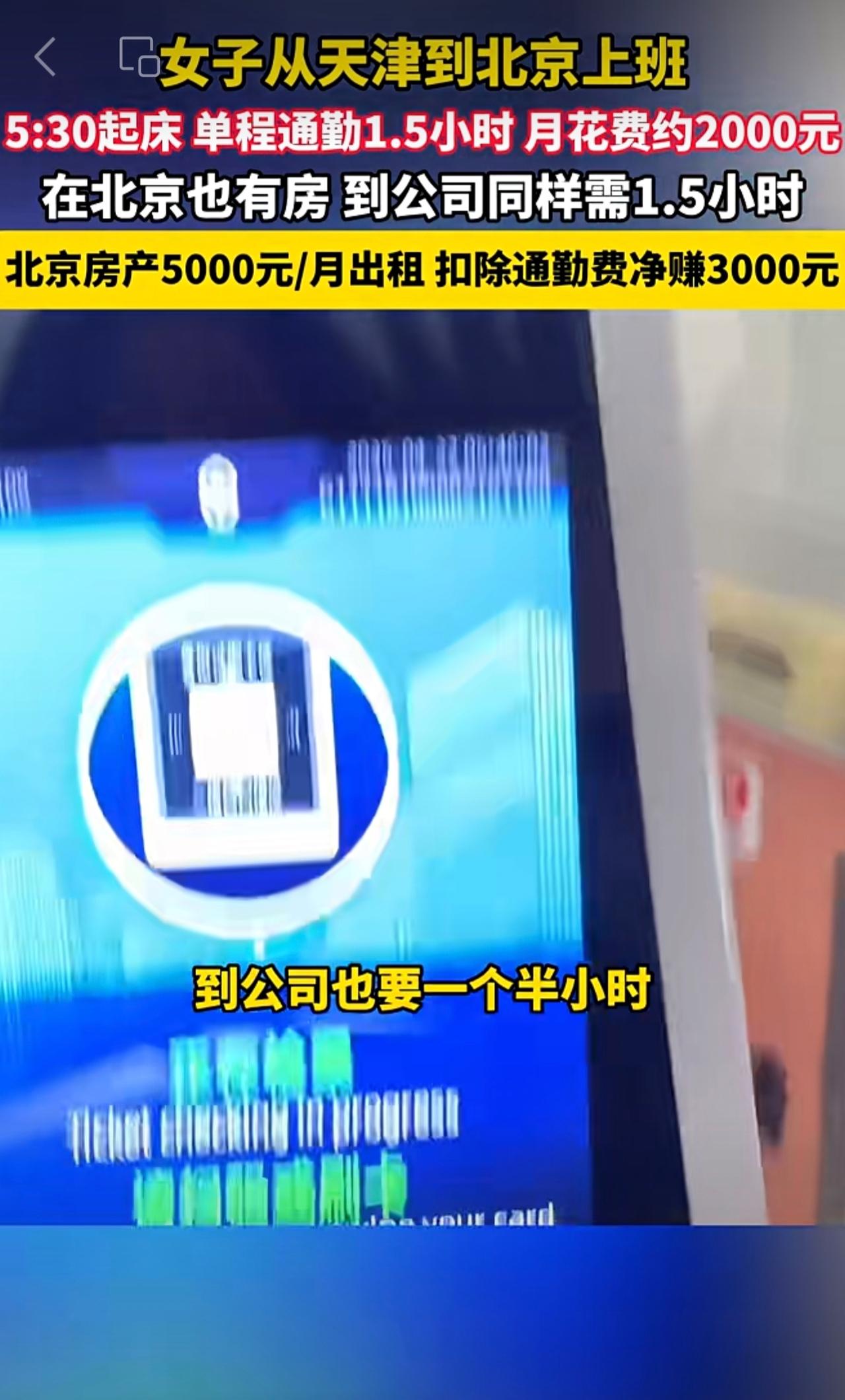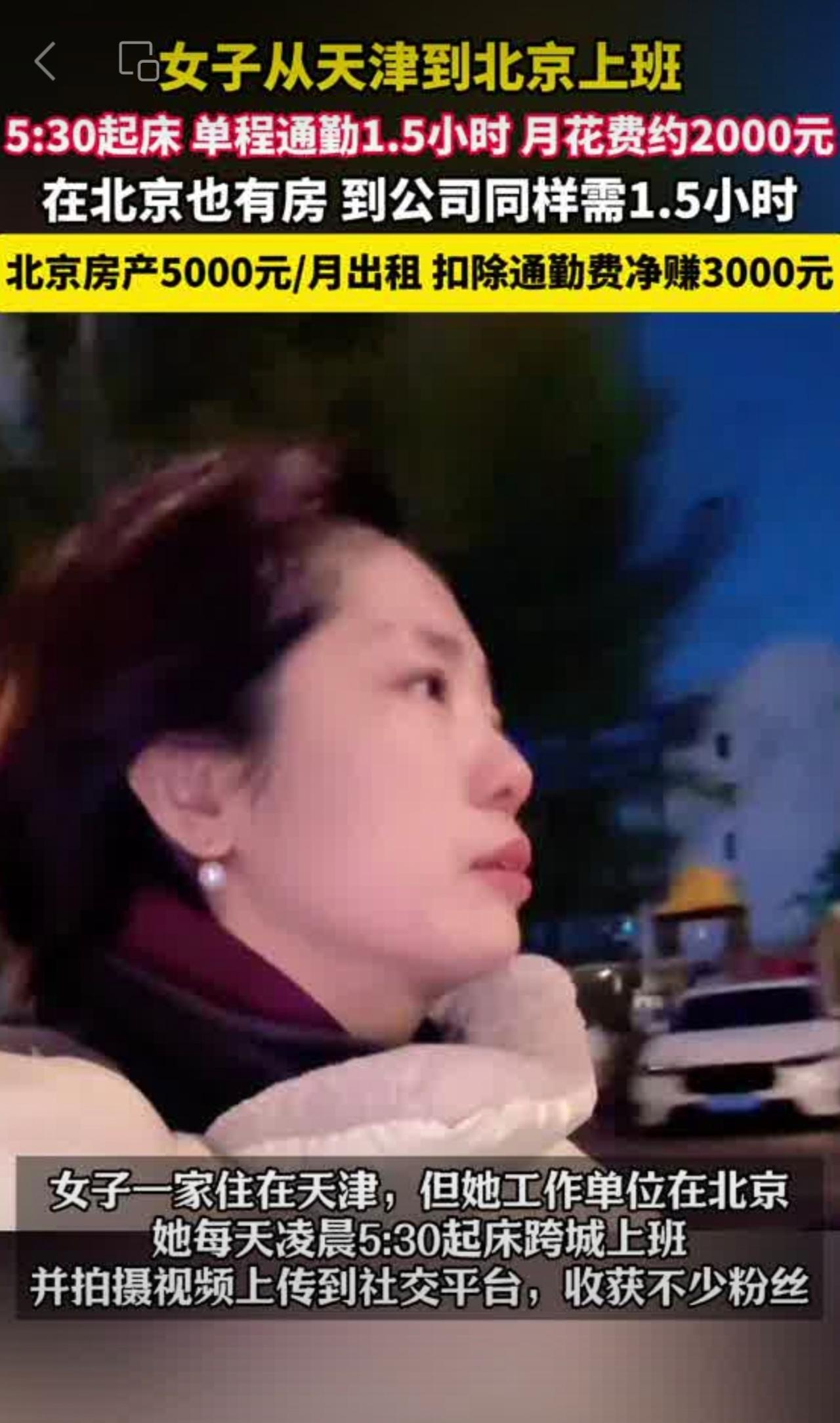 10月22日(报道时间),天津,女子从天津到北京上班,5:30起床 单程通勤1.5小时 月花费约2000元,在北京也有房 到公司同样需1.5小时,北京房产5000元/月出租 扣除通勤费净赚3000元。(来源:海报新闻)