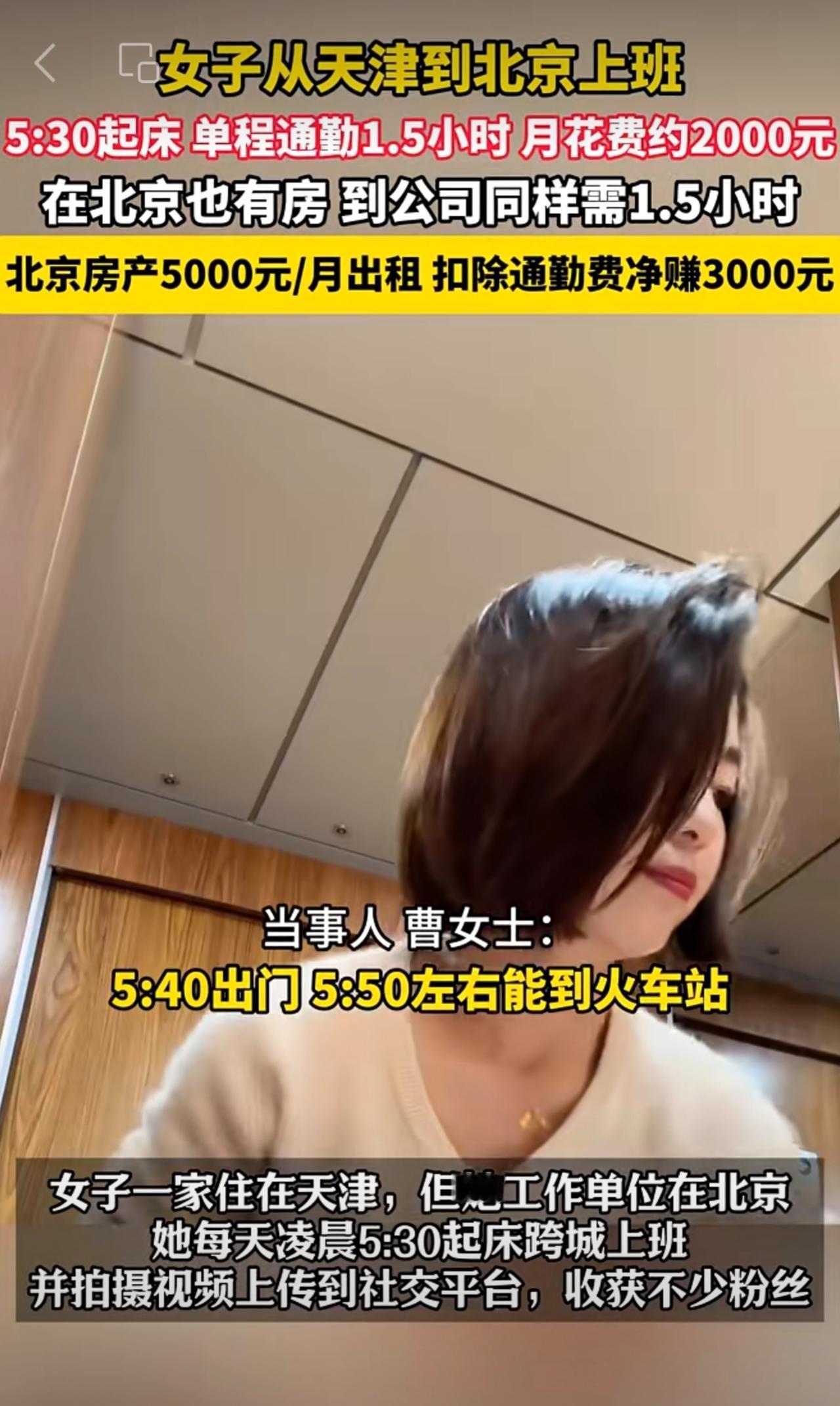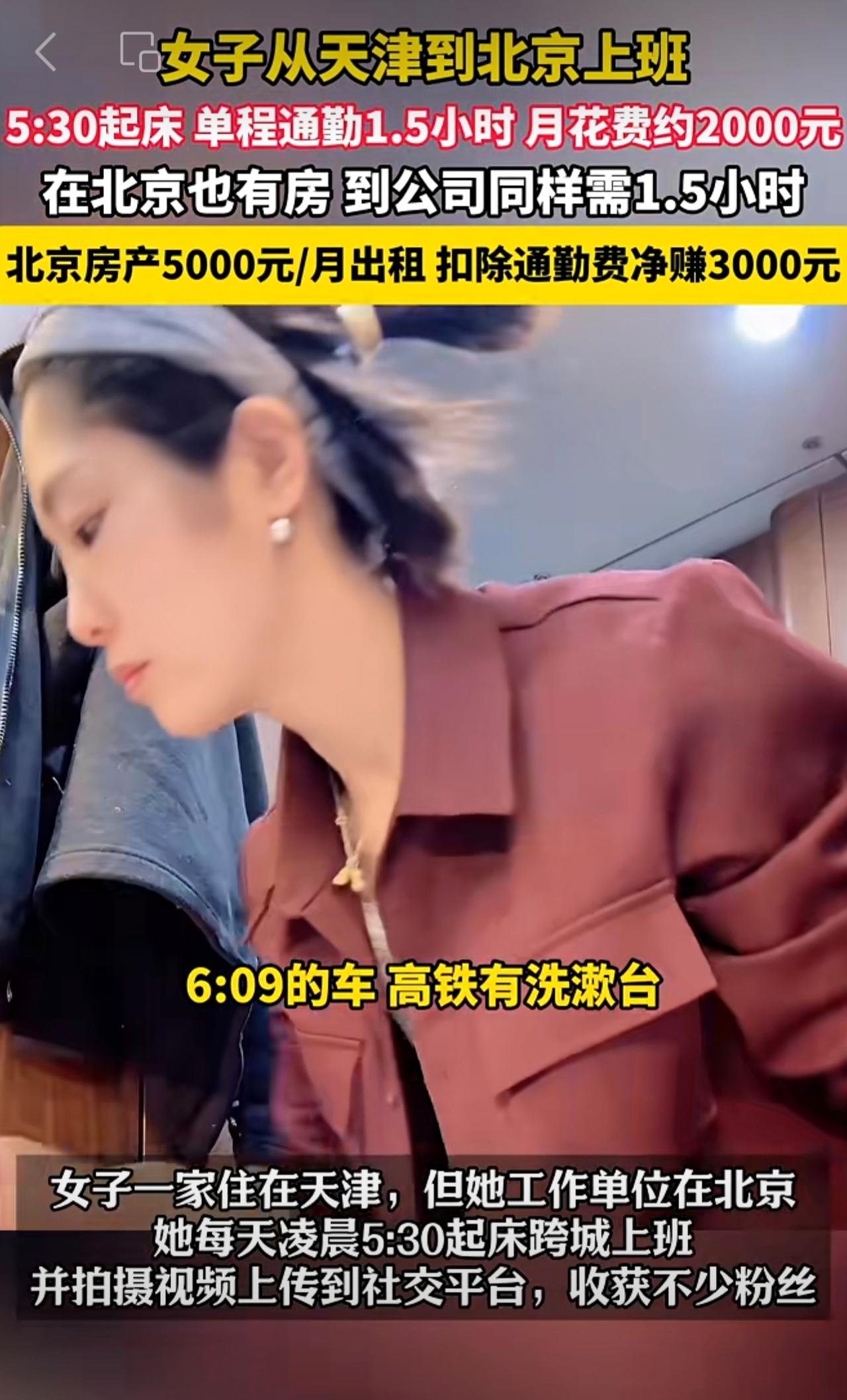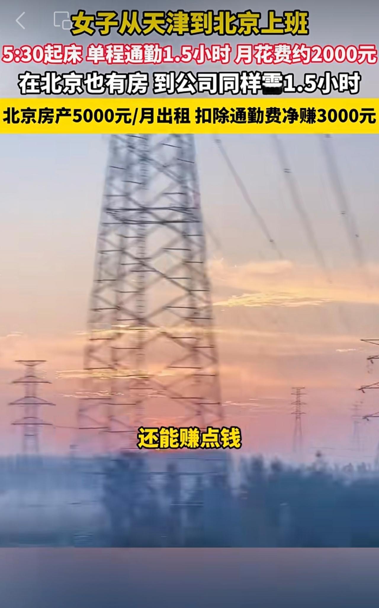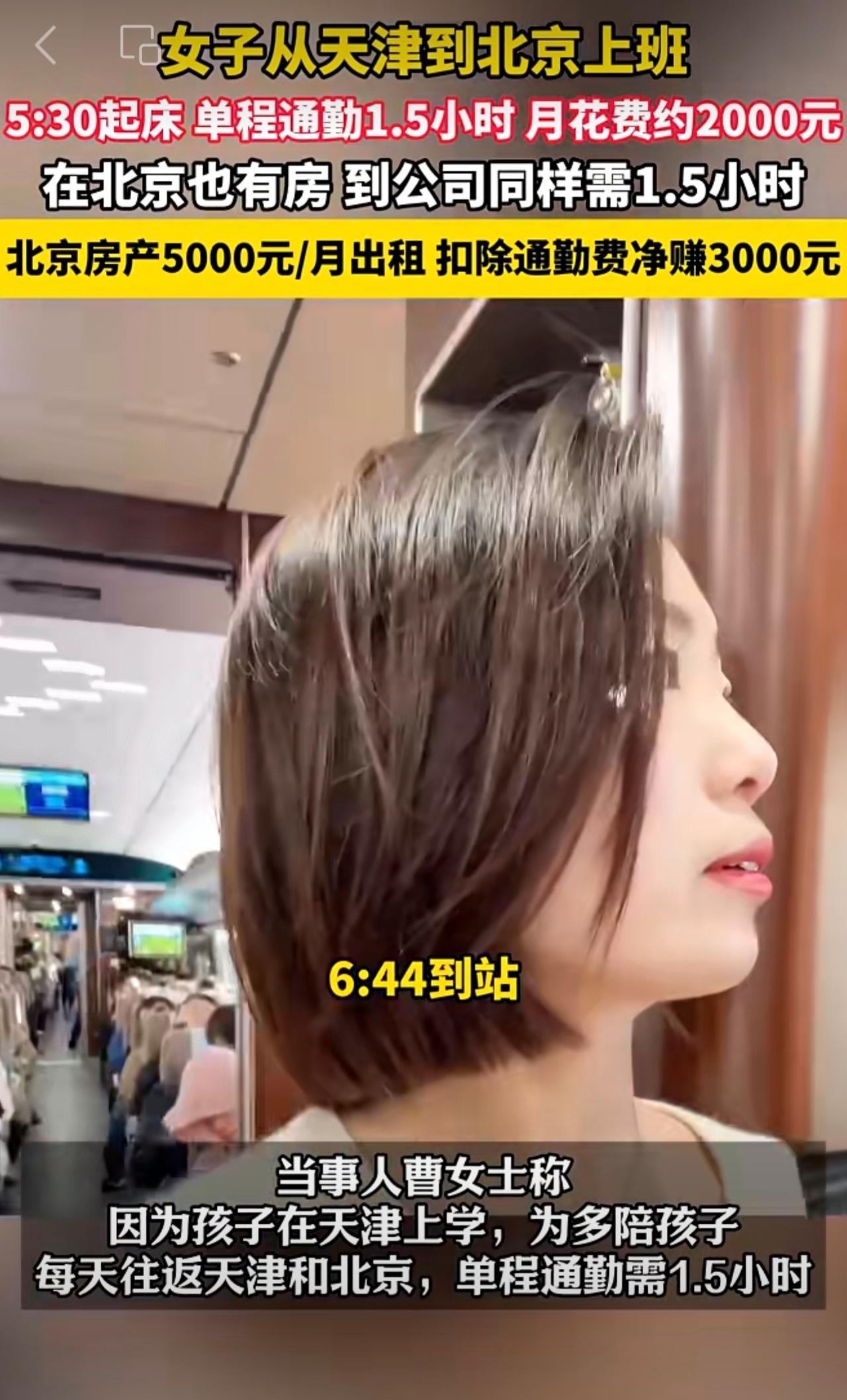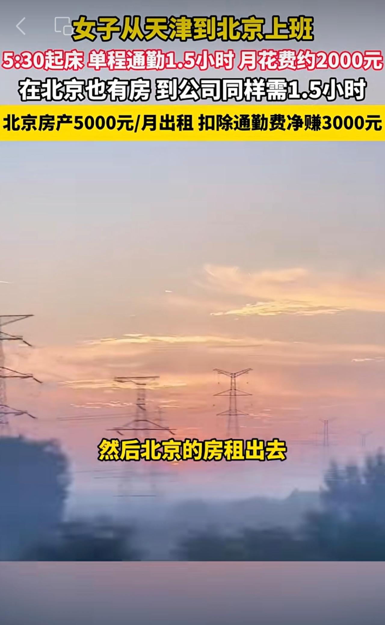 10月22日(报道时间),天津,女子从天津到北京上班,5:30起床 单程通勤1.5小时 月花费约2000元,在北京也有房 到公司同样需1.5小时,北京房产5000元/月出租 扣除通勤费净赚3000元。(来源:海报新闻)