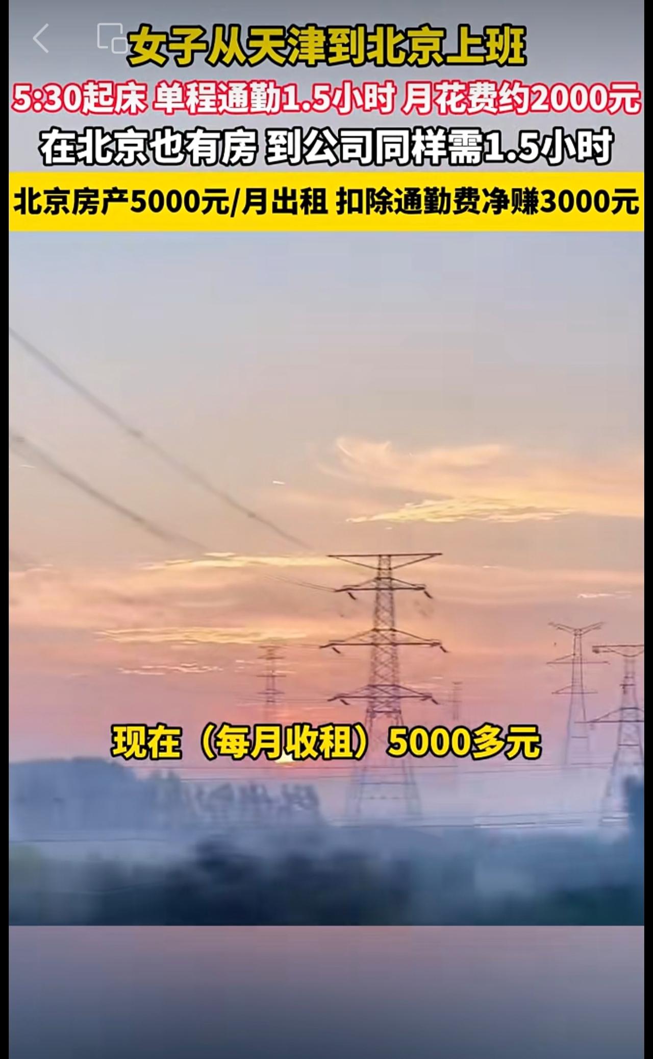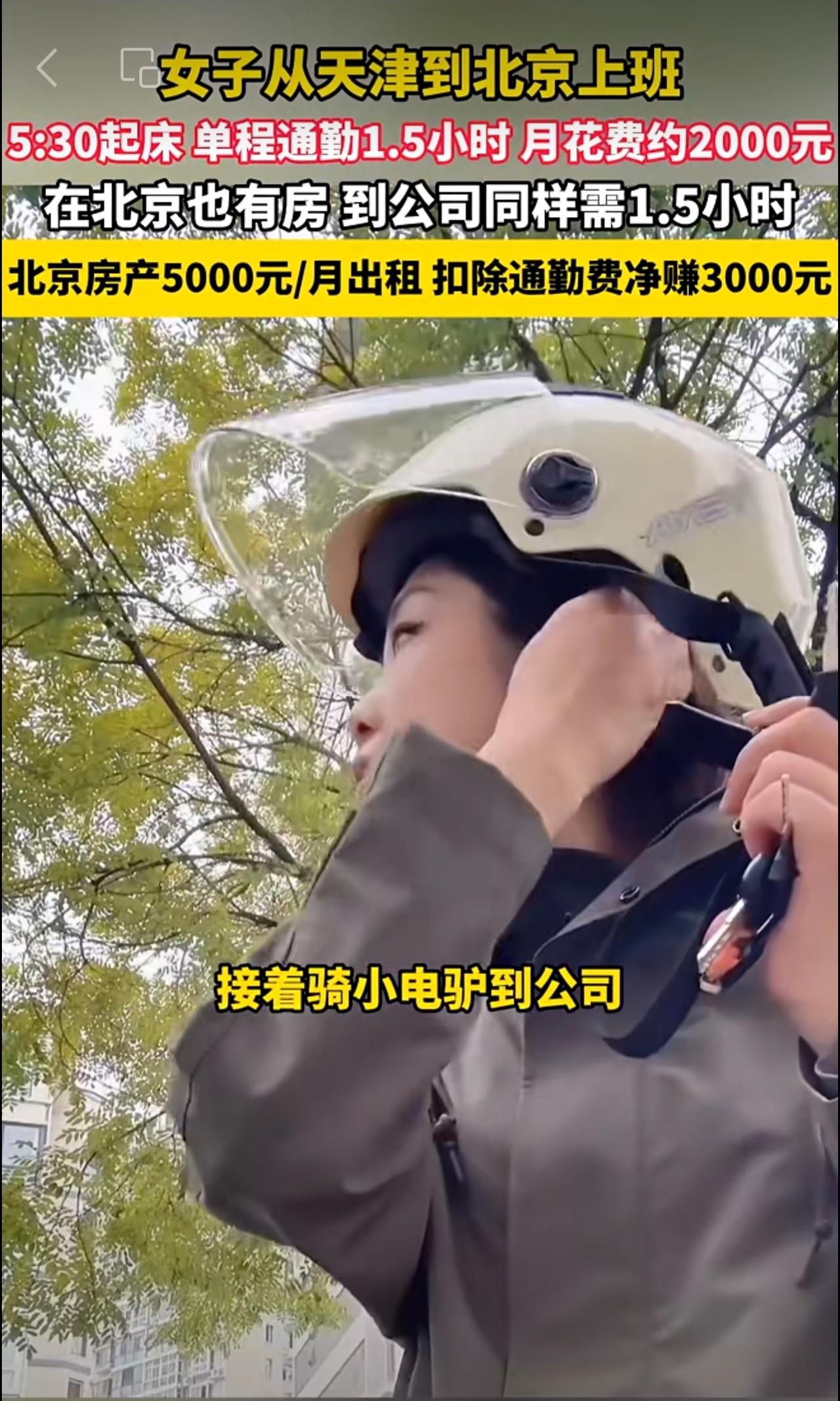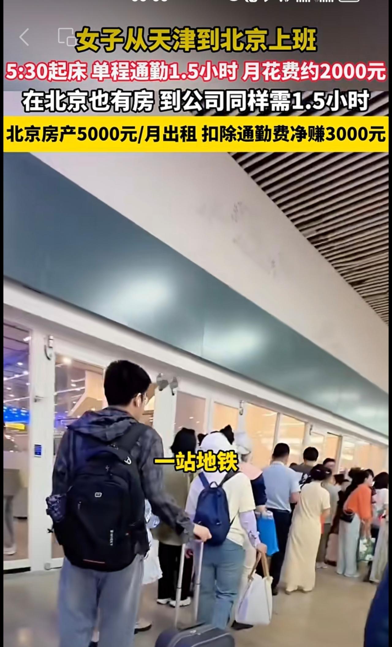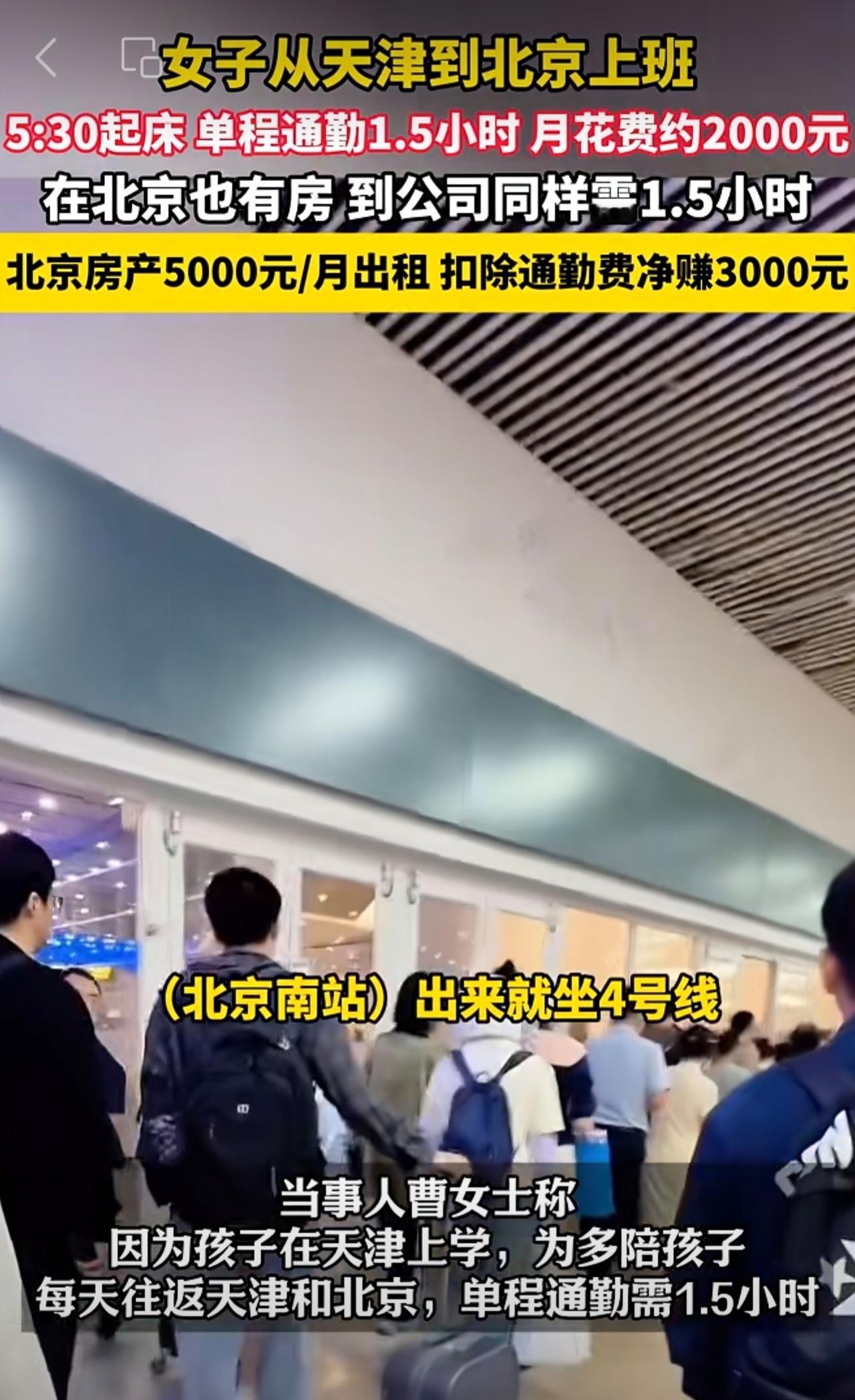 10月22日(报道时间),天津,女子从天津到北京上班,5:30起床 单程通勤1.5小时 月花费约2000元,在北京也有房 到公司同样需1.5小时,北京房产5000元/月出租 扣除通勤费净赚3000元。(来源:海报新闻)