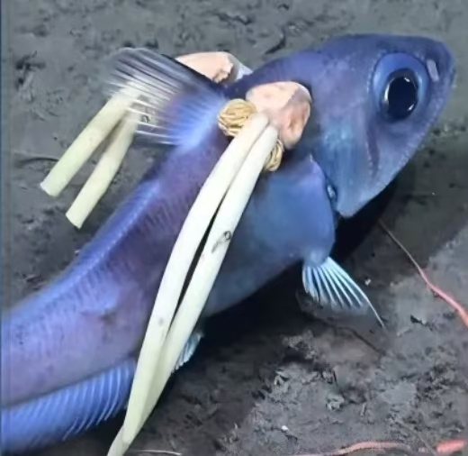 每天一条冷知识 深海鼠尾鳕的"春丽同款双马尾"其实是寄生鱼虱的卵囊。这些桡足类寄生虫以嵌入鱼体吸血为生,雌性鱼虱一般能长到几厘米长,其白色囊袋会随着鱼的游动而飘摇,囊袋里还装着数百枚待孵化的卵……