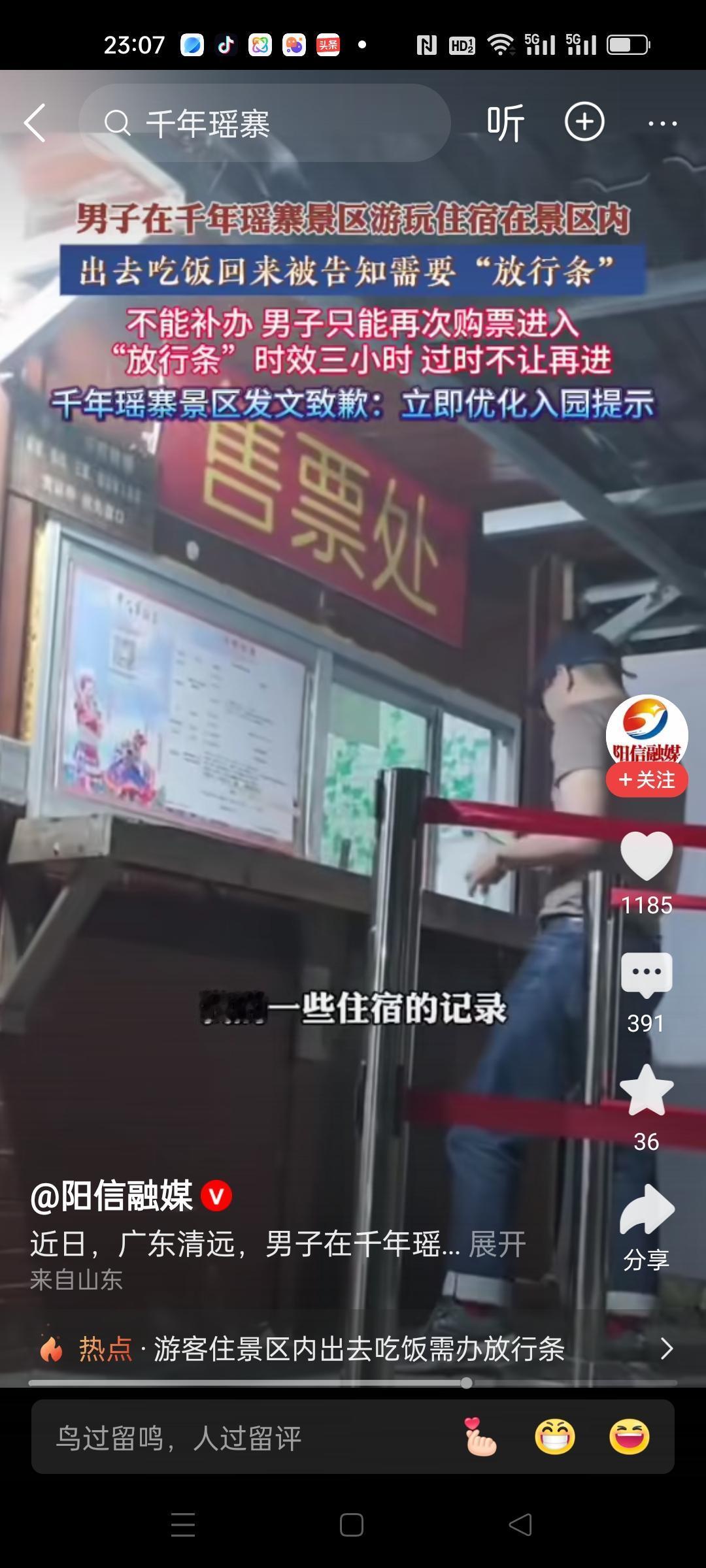 避坑,广东清远千年瑶寨景区! 游客在景区内住宿,出景区去吃个饭,回来不让进了。 想进必须要有放行条,而且时效只有三小时,还不能补办。 游客没办法,重新购票才进入景区。景区这个奇葩做法真是限制了人的可玩性。 游客要是住个三五天,在你这一个景区早玩腻了。想去附近别的地方看看是不可能了,三个小时连吃饭都不够,更别提玩了。 别的景区都是千方百计吸引客人来,想办法留住客人,怎么方便怎么来!这个倒好,还整个放行条。景区后来说要优化入园提示,我建议些别的的景区学习,在景区内住宿的,最起码2天是随便进出。