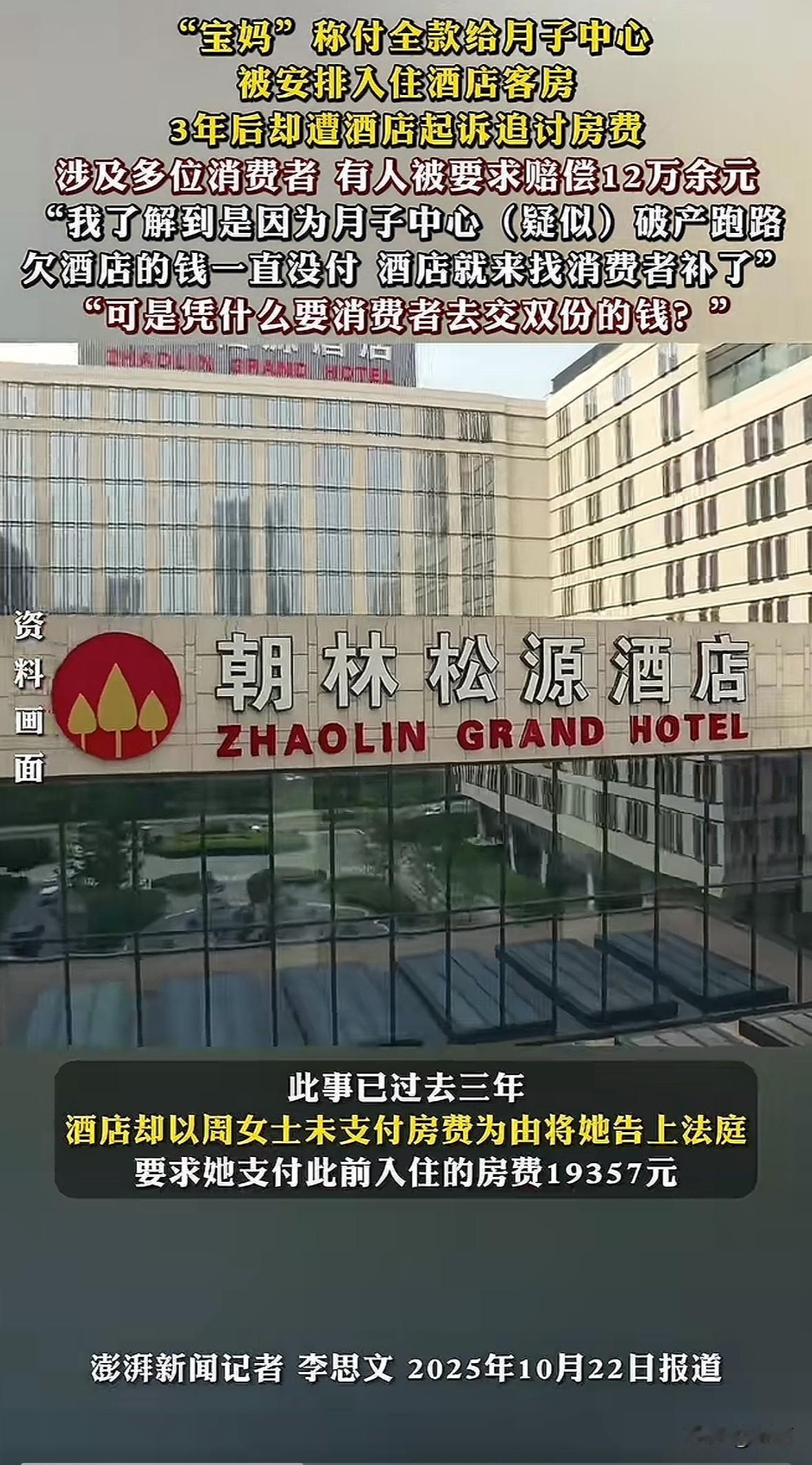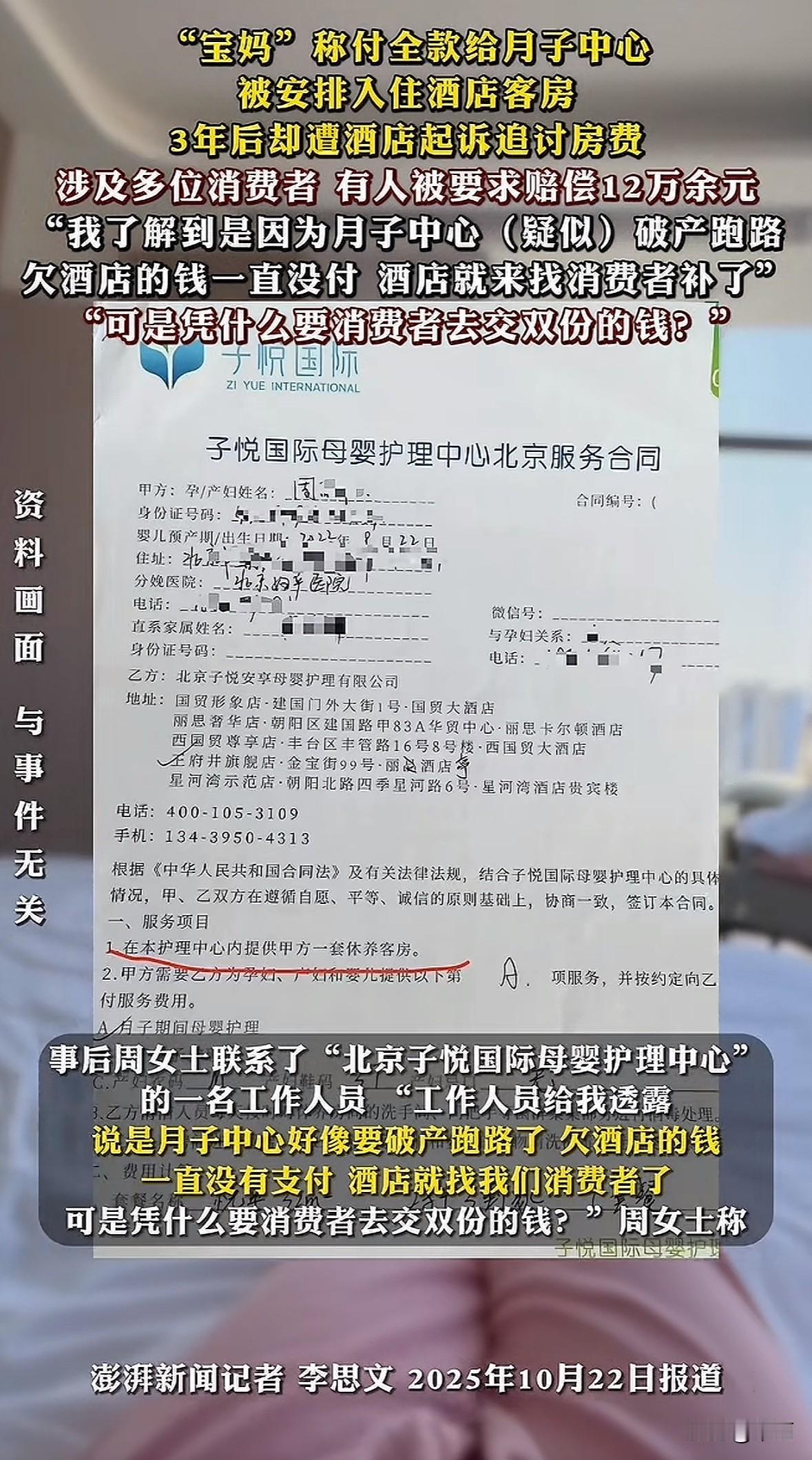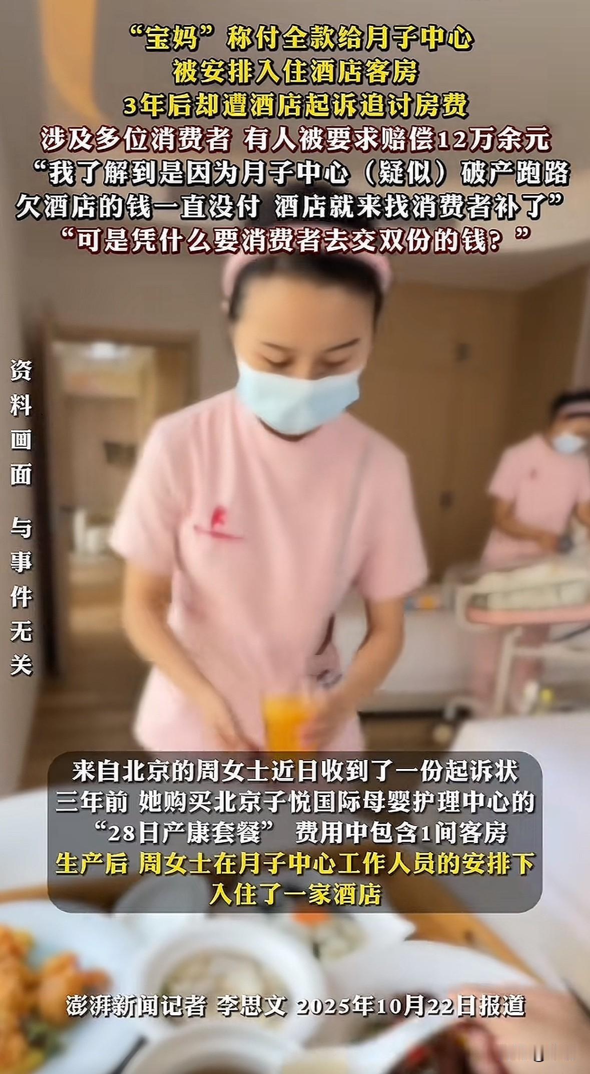 北京多位宝妈遇到糟心事。2022年,她们全款给“北京子悦国际母婴护理中心”交了月子费,合同写着提供休养客房,却被安排进亦庄朝林松源酒店住。 2025年8月起,宝妈们陆续收到法院通知,酒店告她们没交房费,有人被追讨12万多。宝妈们说,入住离店都是月子中心代办,没和酒店签合同,钱早给月子中心了。 涉事月子中心已被列入经营异常,法人还被限高。律师说了,这是合同相对性原则,宝妈只和月子中心有合同,酒店该找月子中心要钱。 这事太气人,经营者的纠纷凭啥让刚生完娃的宝妈买单?希望能尽快解决,也给其他宝妈提个醒,签合同得更留心。