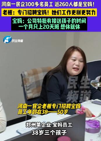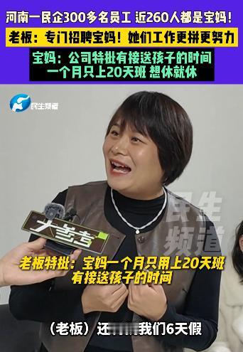 河南一老板招35岁以上的宝妈,10月21日,公司300多名员工,近260名宝妈在职,弹性上下班,每月休10天,晚来早走每月上20天班。[比心] 在郑州一家冻品公司,打卡机不再是个冷冰冰的监工,上午九点还有人匆匆进门,下午四点多就有人笑着道别接娃去啦。 这不是管理松懈,而是老板王宾为260多名宝妈员工特意设计的弹性工作制,他的公司300多名员工中,宝妈占比超过八成,这个独特的模式正在重新定义职场规则。 王宾经营的千百味商贸有限公司主营冻品批发,他深知35岁以上宝妈在职场中的困境,找工作时常面临年龄和性别双重歧视,却又要承担养家重任。 正是这份理解,让他打造出独特的“宝妈友好”制度:每月休息10天,只需工作20天,允许弹性上下班接送孩子,不扣工资,也不用层层审批。 这里的收入更让人眼前一亮,新人入职两三个月后,月薪基本能过万,业绩突出的甚至能拿到好几万元。 一位宝妈展示的工资条上,29000元的数字格外醒目,她笑着说,以前给孩子买衣服都要犹豫,现在不仅能报兴趣班,还能存下应急钱。 这么宽松的管理,公司没有亏,实际情况恰恰相反,公司员工离职率仅远低于行业平均水平,2024年营收增长35%,客户回款速度也明显加快,用实际行动践行“员工第一”的理念。 这些被其他企业视为“负担”的宝妈,在这里却成了宝藏员工,她们格外珍惜工作机会,做事特别认真负责。 有人为了给孩子赚手术费,主动开拓新客户,有人利用接娃路上的碎片时间回复消息,订单转化率比年轻人还高,老员工还会主动介绍身边的宝妈入职,为公司省下大量招聘成本。 这个消息一经发出,网友们纷纷发表了各自的看法。 “看到河南这位老板专门招聘宝妈还月休10天的新闻,感觉心里挺暖的,这年头,能为职场妈妈实实在在考虑的公司真的太少了。” “这才是真正帮宝妈解决大问题了。” “我们找工作太难了,一问年纪超过35岁,再看你有小孩,很多公司直接没下文了。” "这种理解和支持,对很多努力想兼顾家庭和事业的妈妈来说,非常宝贵。" “别看每月休10天,员工稳定性高,老板反而赚了。” “如果更多企业,哪怕不同行业,都能借鉴这种人性化管理思路,设置些‘妈妈岗’,社会效率和个人幸福感都会提升很多。” “妈妈们为了家和孩子能拼尽全力,这种劲头用在工作上,能量是惊人的。” “有的老板总怕员工赚多了,千方百计克扣,员工收入高了,状态好了,公司发展更好了,这才是真智慧。” 你所在的城市或行业,有没有遇到过这种为特定员工群,提供弹性工作制或特别支持的企业?你觉得推行这种模式最大的挑战会是什么? 欢迎在评论区分享你的见闻和看法! 信息来源:民生频道