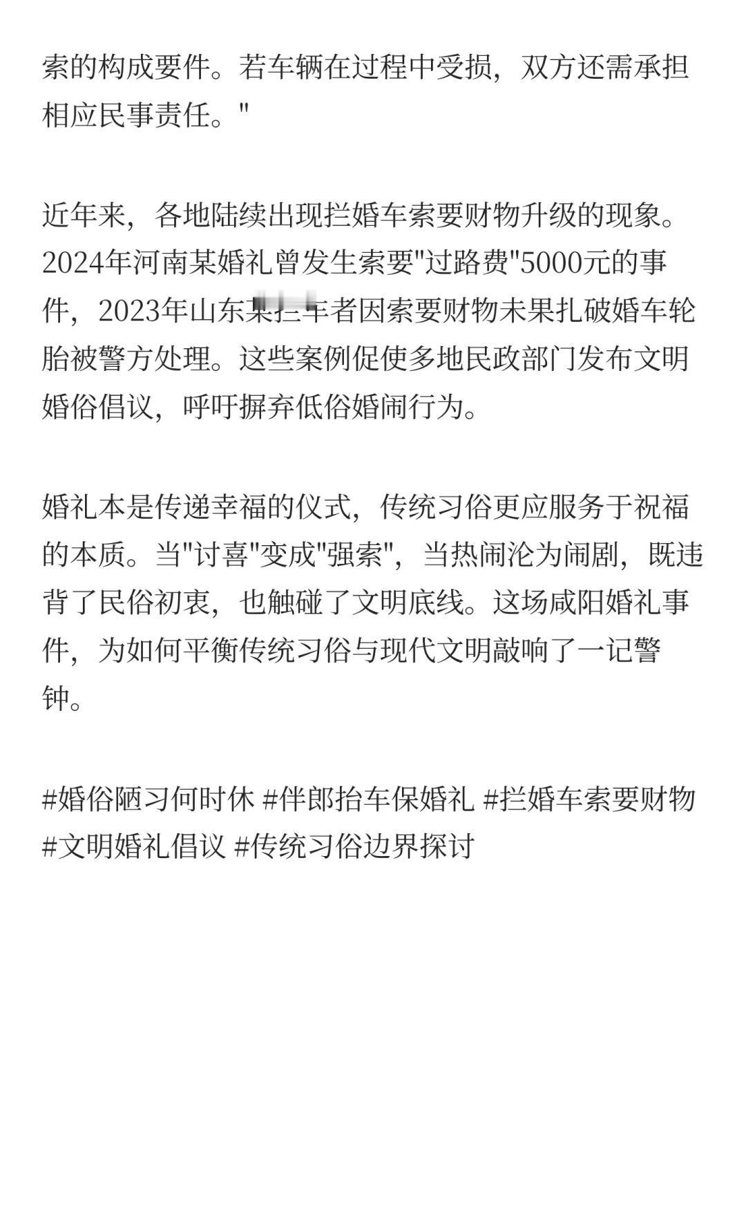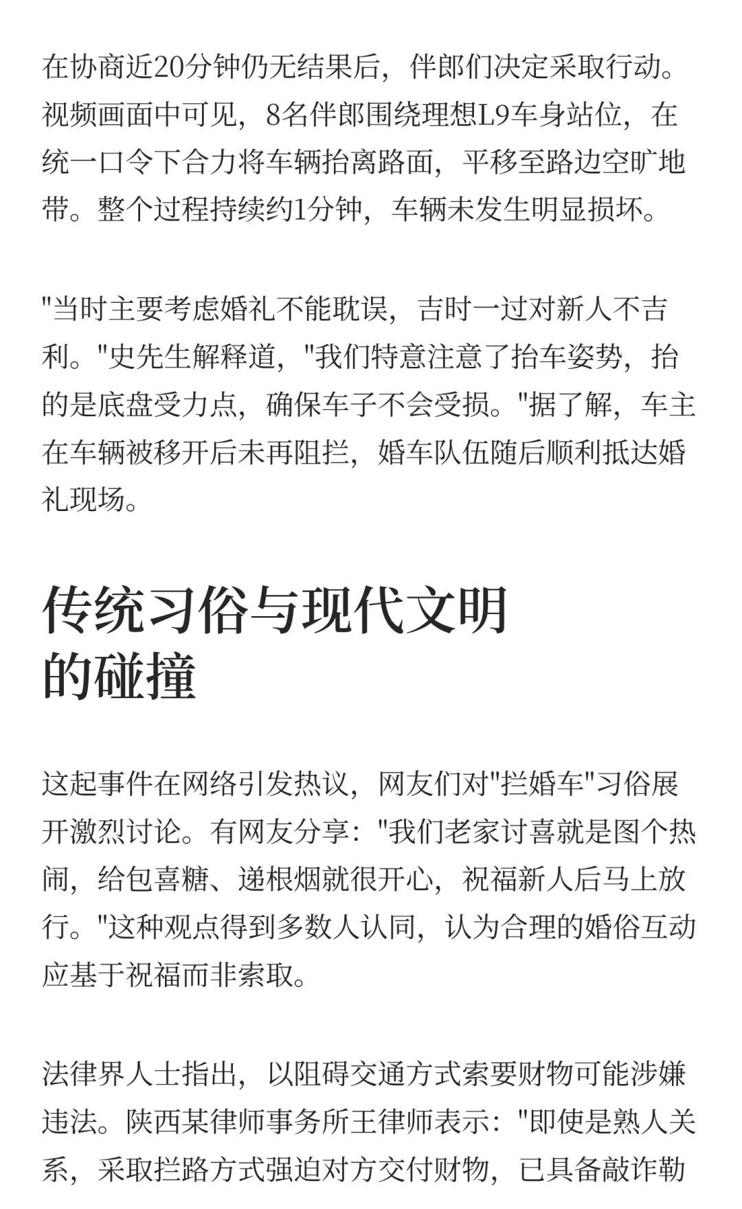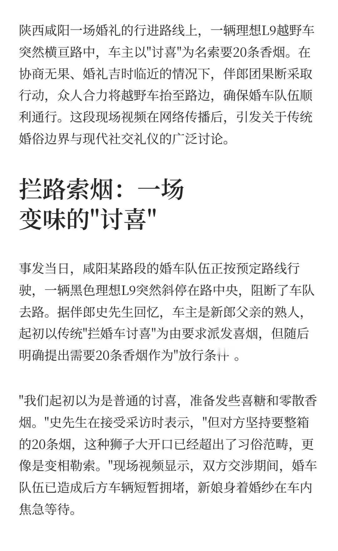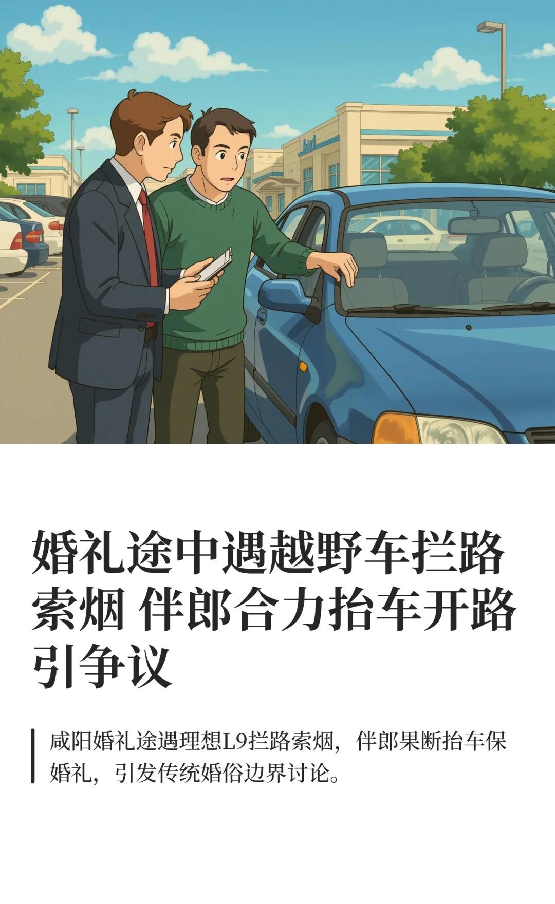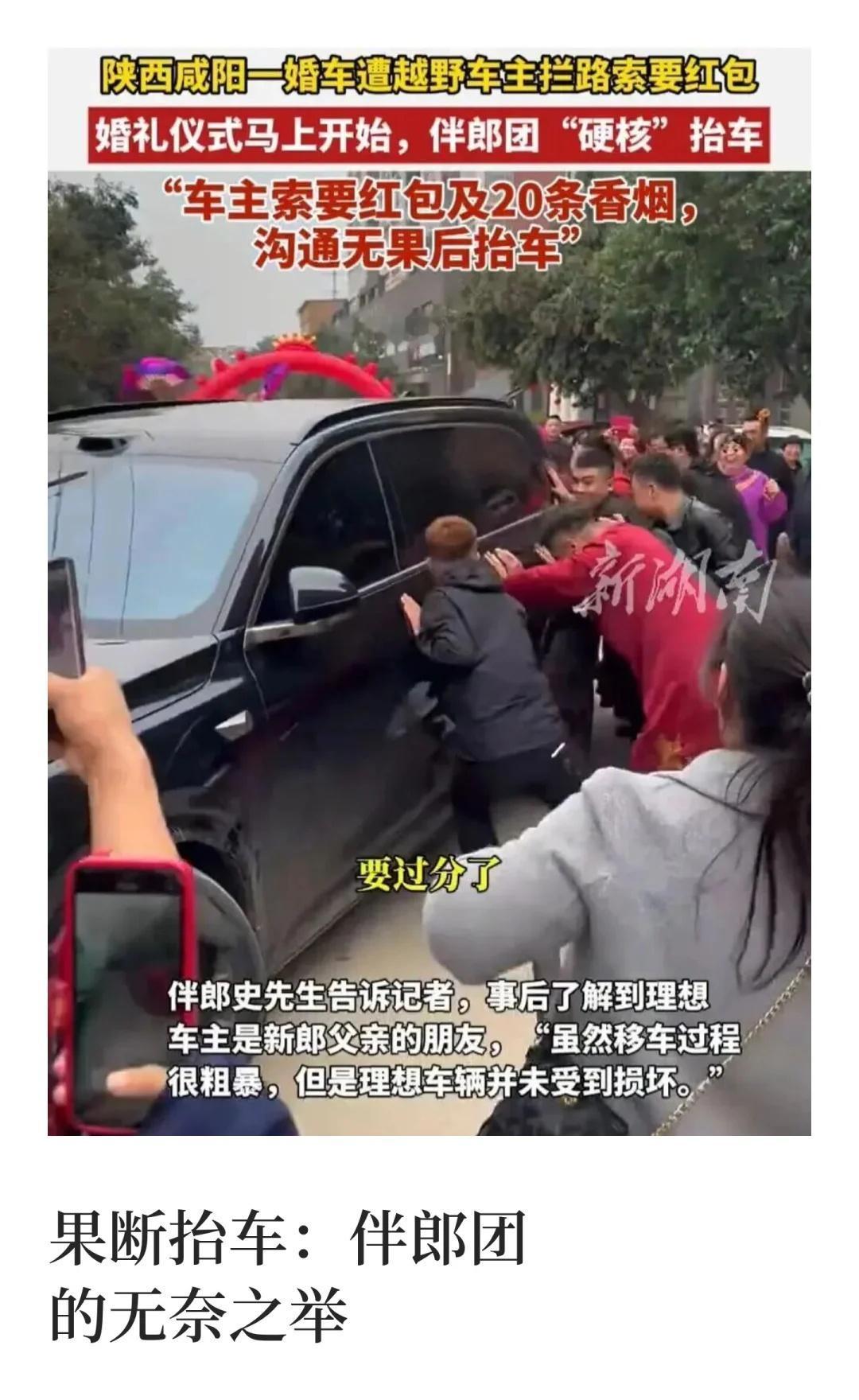 婚礼途中遇越野车拦路索烟 伴郎合力抬车开 婚俗陋习何时休 伴郎抬车保婚礼 拦婚车索要财物 文明婚礼倡议