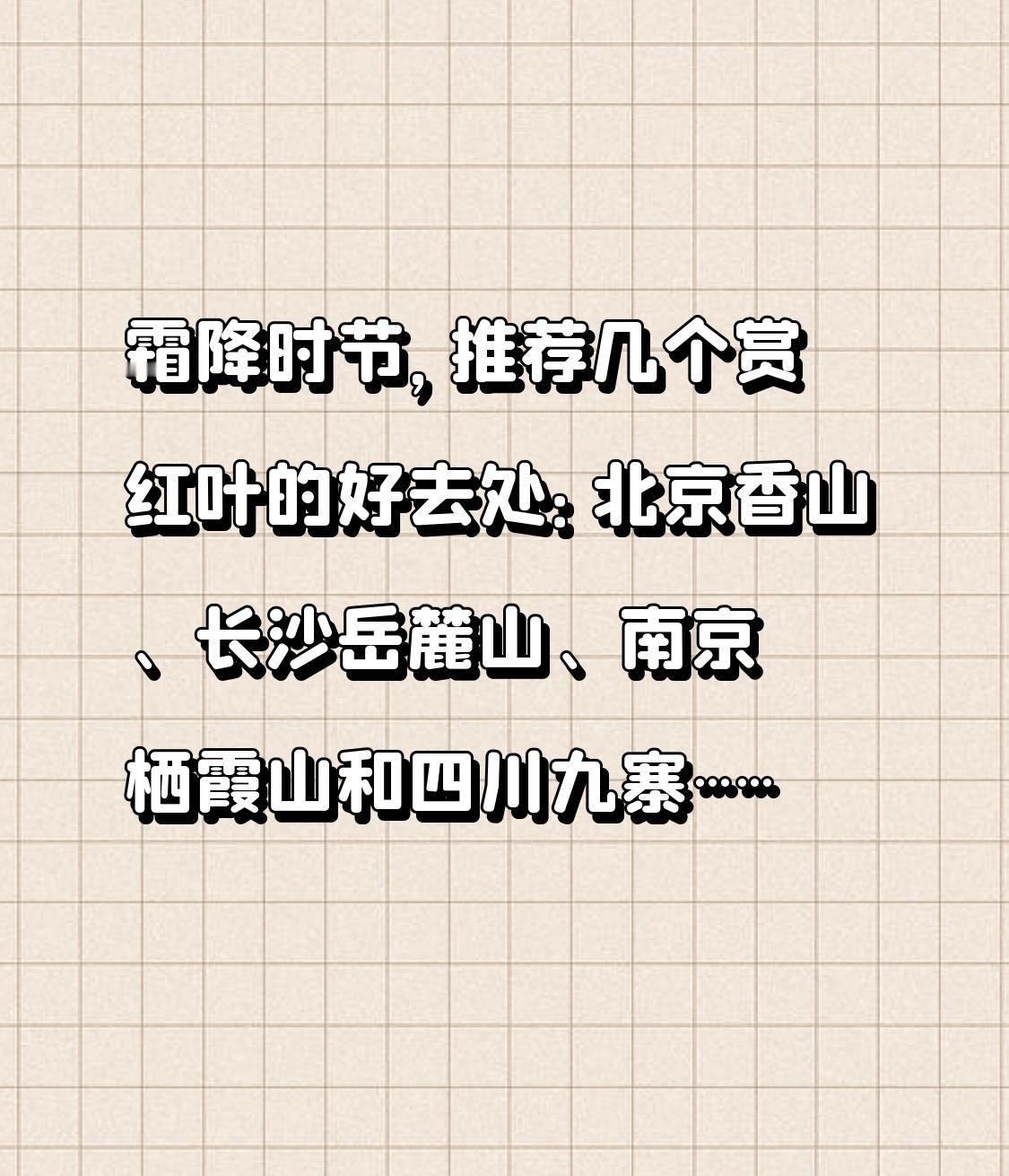 霜降时节,赏红叶是一大美事。北京香山是老牌赏红叶胜地,漫山遍野的红叶,像是大自然打翻了调色盘。“停车坐爱枫林晚,霜叶红于二月花”的意境在这里体现得淋漓尽致。 长沙岳麓山也不容错过,古色古香的建筑与红叶相互映衬,别具一番韵味。 南京栖霞山的红叶则透着一股历史的厚重感,漫步其中,仿佛穿越回了古代。 四川九寨的红叶更有独特之处,五彩斑斓的湖水与红叶交相辉映,美如仙境。 此外,山东潍坊临朐石门坊景区也值得一去,它是中国五大红叶景观地之一,3000余亩原生黄栌林,“全红时刻”极为壮观,“齐鲁红叶之冠”名不虚传。