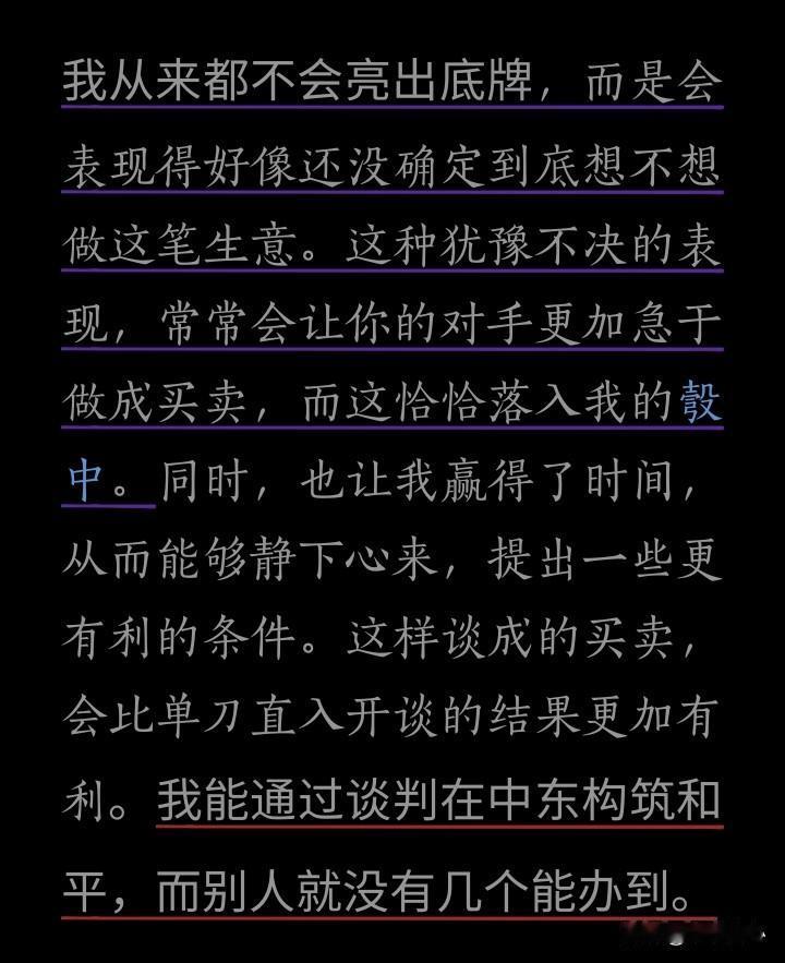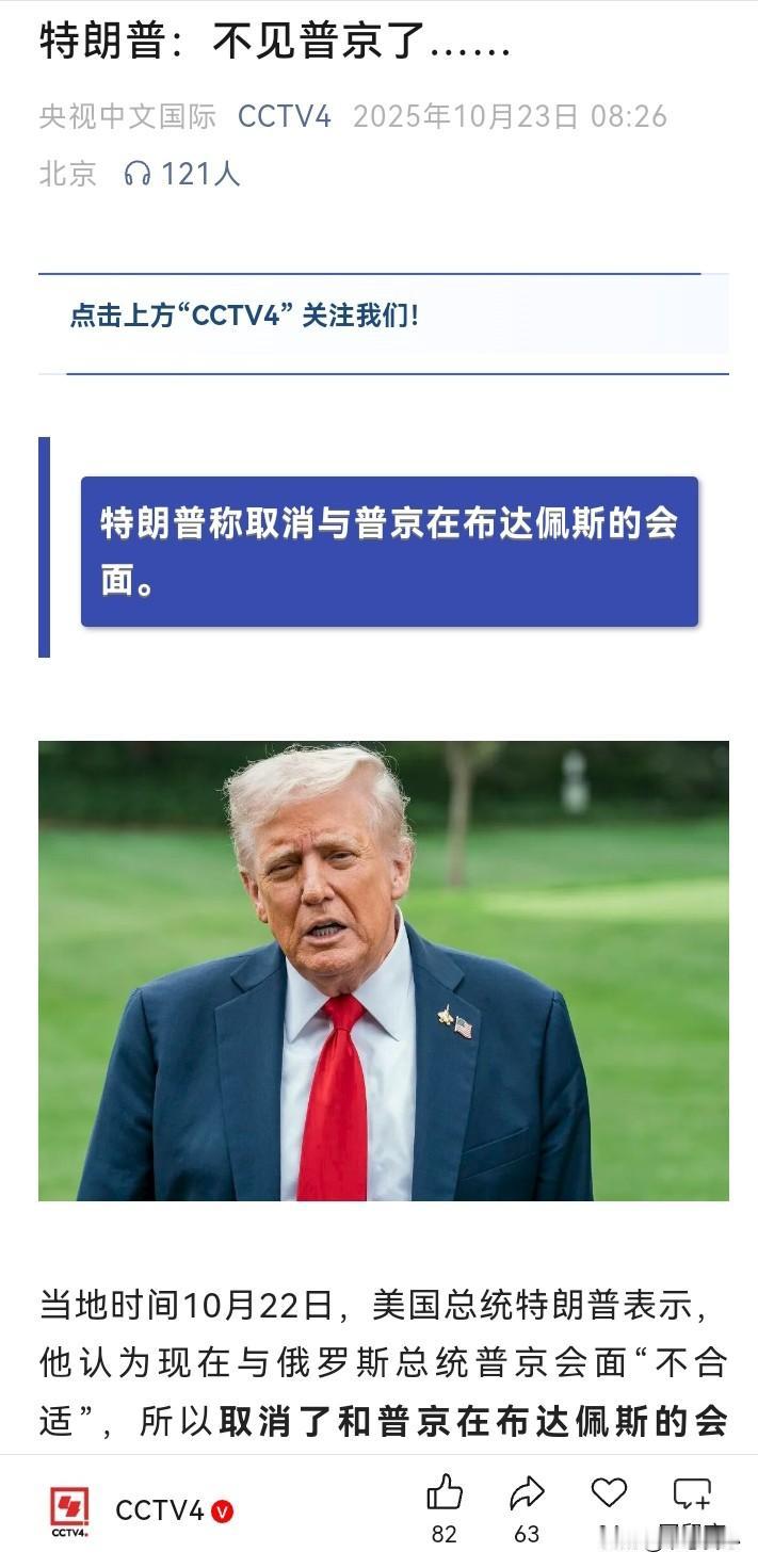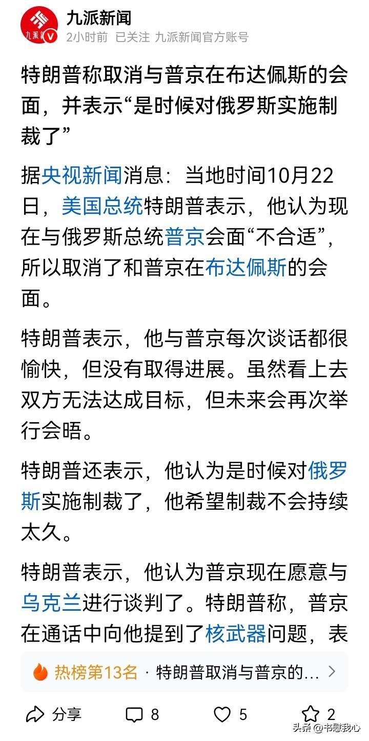 普京别慌,这是特朗普的一贯伎俩! 本来说好的“见一面”,特朗普表示自己认为现在与普京会面“不合适”,所以取消了两人在布达佩斯的会面。 其实,8月份在阿拉斯加的时候,大家不说好了下一次见面在俄罗斯境内嘛(8月在美国境内,下一次在俄罗斯境内),还说了“莫斯科”,特朗普也没有表示反对。 到再次通话时,又变卦到了第三国见面。要知道,到匈牙利直线距离不远(1500里左右),只是在目前的国际形势下,普京肯定是要绕飞经过土耳其、塞尔维亚,那就是5000公里。 尽管如此,普京也还是答应到匈牙利的布达佩斯见面。 可是,如此的诚意满满,特朗普说变就变,取消会面。不仅取消,还威胁对俄罗斯制裁。 而且,美欧对俄罗斯的新一轮制裁已经出来了! 看着很反转,对吧。 只能说,普大帝,别慌,这是特朗普的一贯伎俩。 之前看过一些特朗普的书籍、谈话,摘录如下: “我从来都不会亮出底牌,而是会表现得好像还没确定到底想不想做这笔生意。这种犹豫不决的表现,常常会让你的对手更加急于做成买卖,而这恰恰落入我的彀中。” “这是一个好问题。有时你必须有放弃交易的能力,换句话说,他是在和你谈判对吧?有时你必须能够站起来说,你骗了我,你对我撒谎,你误导了我,我不谈了。现在有两种可能:要么你将会让交易告吹,要么你将得到一切想要的东西。如果你没有准备好,就不要这样做。你任何时候都必须有放弃交易的能力。” 以上两段是特朗普关于谈判、交易的阐述,他会表现得犹豫不决,甚至反转(本来说会面,变成可能不见,到取消会面),其实都是为了让对手做出更大的让步。有时候,他又说对手欺骗,我们不谈了;其实,他也预期着两种结果,大不了不谈,如果谈的话,自己就会赢! 比如说,这次特朗普就表示,“他与普京每次谈话都很愉快,但没有取得进展。虽然看上去双方无法达成目标,但未来会再次举行会晤”。 所以,这次不见面,说不定下周/下个月又电话聊聊,再约一个时间地点呗。 当然,以普京的见多识广,特朗普这样的做法,想来也逃不过他的法眼! 书慰我心说国际时政
