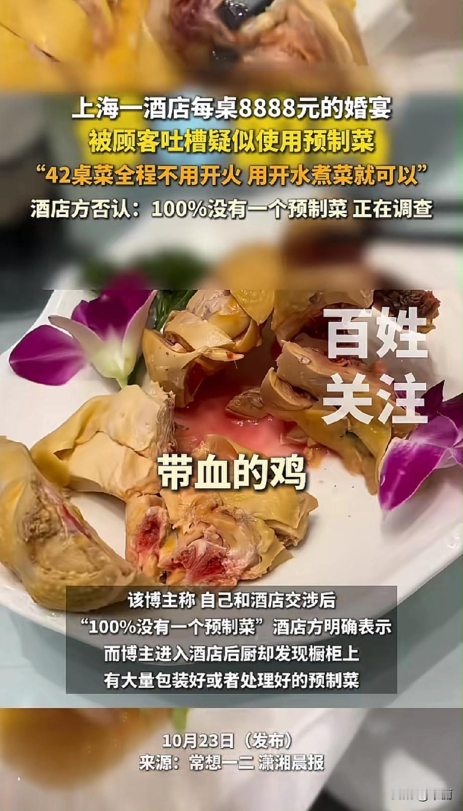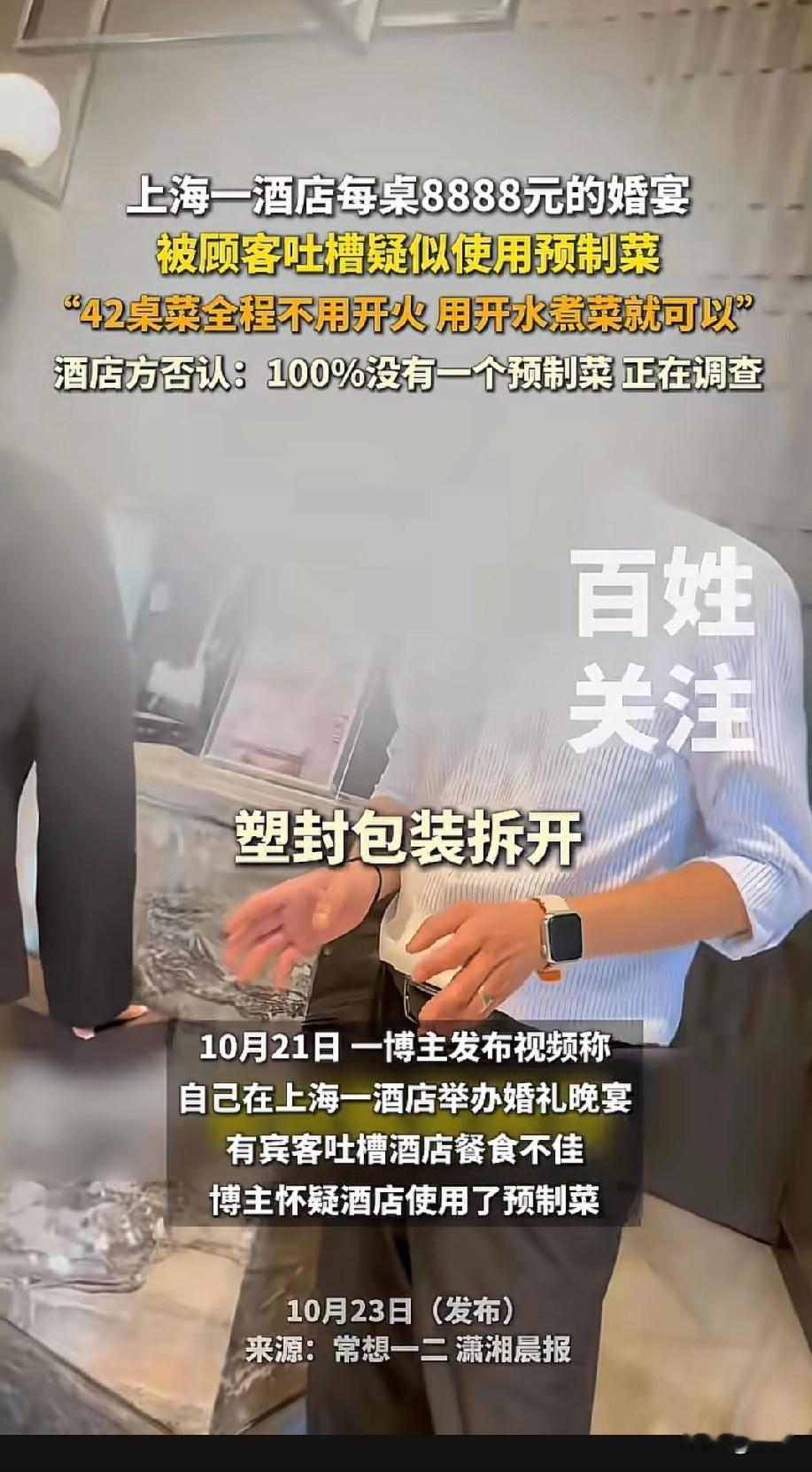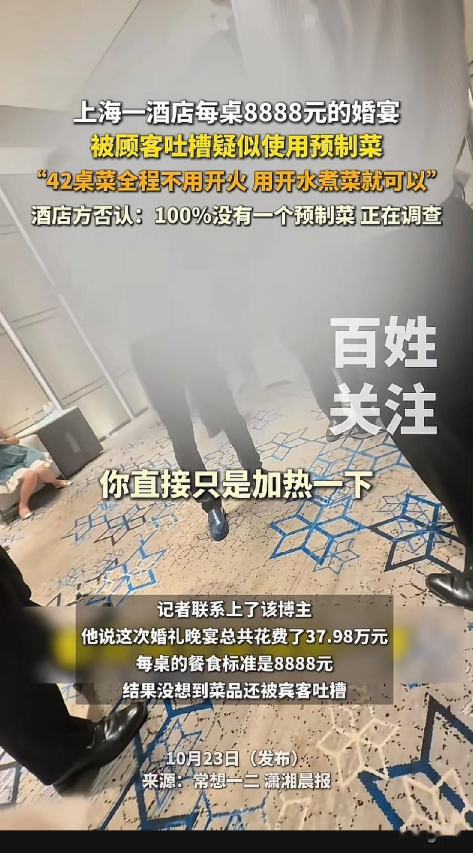 上海中优城市万豪酒店,博主花37.98万办婚宴,每桌8888元。宾客吐槽菜难吃,怀疑是预制菜。 博主找酒店对质,对方说“100%没有一个预制菜”。结果他进后厨,看见橱柜里全是包装好的预制菜,菜单上的德国咸猪手、八宝饭都在里面。新鲜虾换成了冷冻熟虾,马蹄笋也是预制的,海鲜贝壳空壳没肉,白切鸡还带血水。 博主发视频曝光,反被酒店发律师函,说他“发布不实言论”,要他删视频道歉。 记者问酒店,客服不回应,宴会厅说在调查。现在市场监管已经介入核查了。 8888元的标准,花的是现做菜的钱,拿到的却是预制菜,还不提前说。消费者有权知道吃的啥,这种不透明太坑人,坐等调查结果给个说法 。