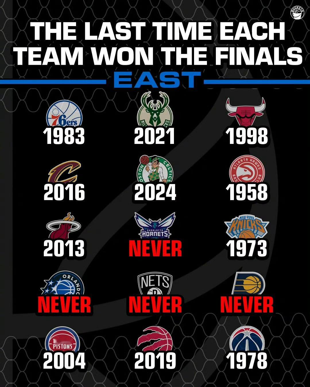 NBA各支球队上一次获得总冠军的时间[照相机]