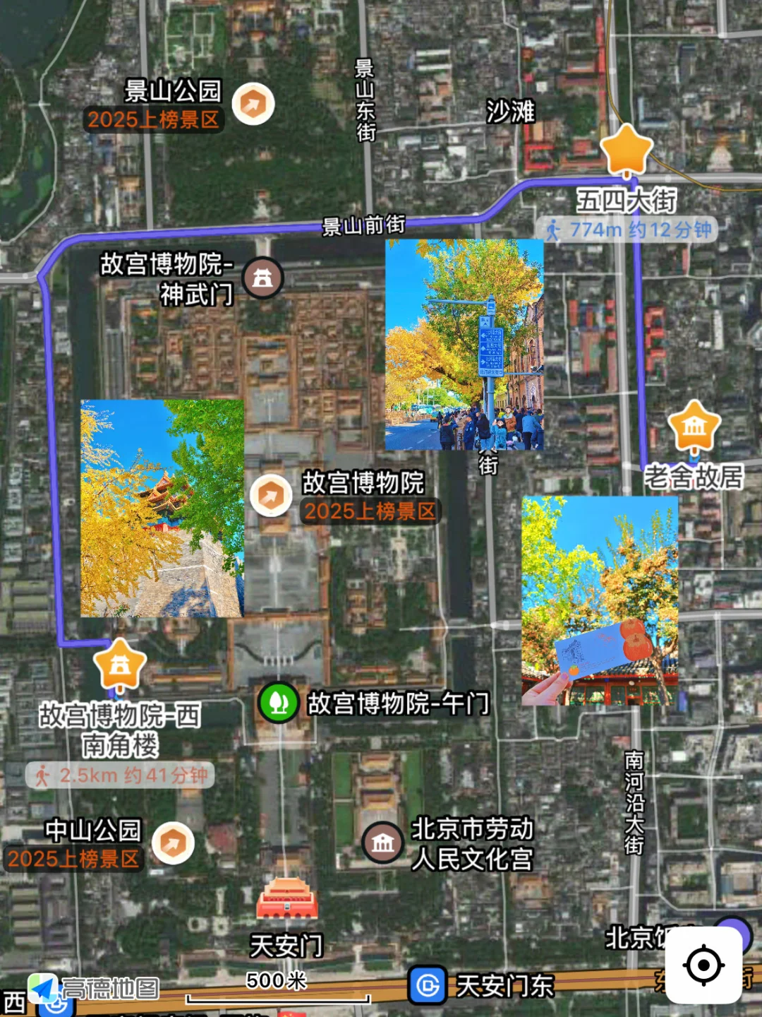 2025.10.21漫步在老舍笔下的北平之秋 不经意的街景也都是满满的浪漫 🚏免费citywalk路线 老舍故居➡️五四大街➡️故宫西南角楼 全程3km步行约1.5h,一步一秋景 📝实用贴 老舍故居如果预约满了,线上就多刷几次 我当天刷十分钟约上的,不用身份证约上全天可进 五四大街两侧各走一遍,景色不相同都很美 故宫西南角楼下午5点左右夕阳下📷更美