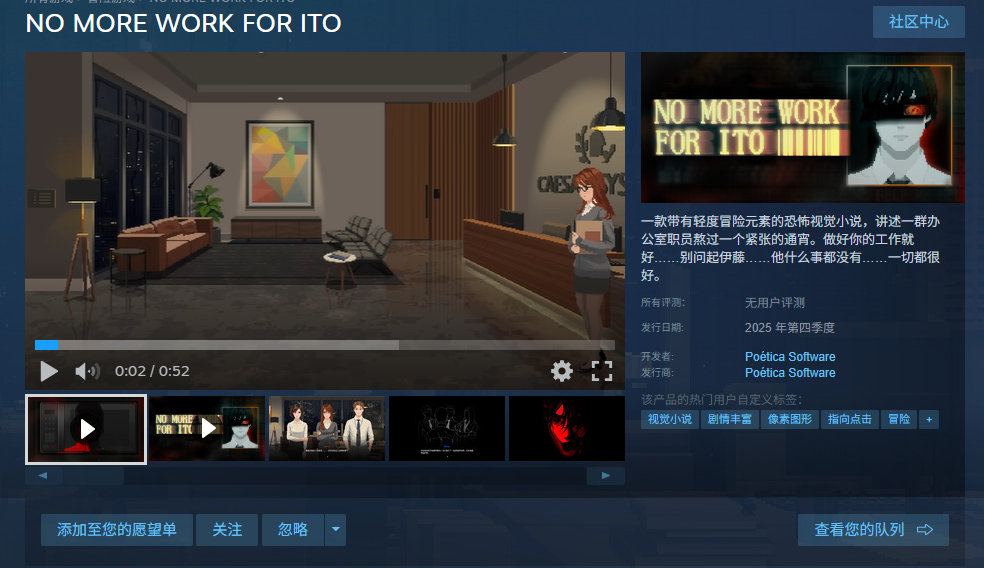恐怖视觉小说游戏《NO MORE WORK FOR ITO》将于第四季度登陆Steam,支持中文配音与字幕,商店页面有免费试玩Demo。被工作榨干了的丹尼尔已经精疲力竭,而更糟糕的事情发生在一个通宵之前——办公室谋杀传闻。调查一起可能的失踪案,调查一起可能的凶杀案,调查一名可能存在的连环杀手。Steam游戏推荐