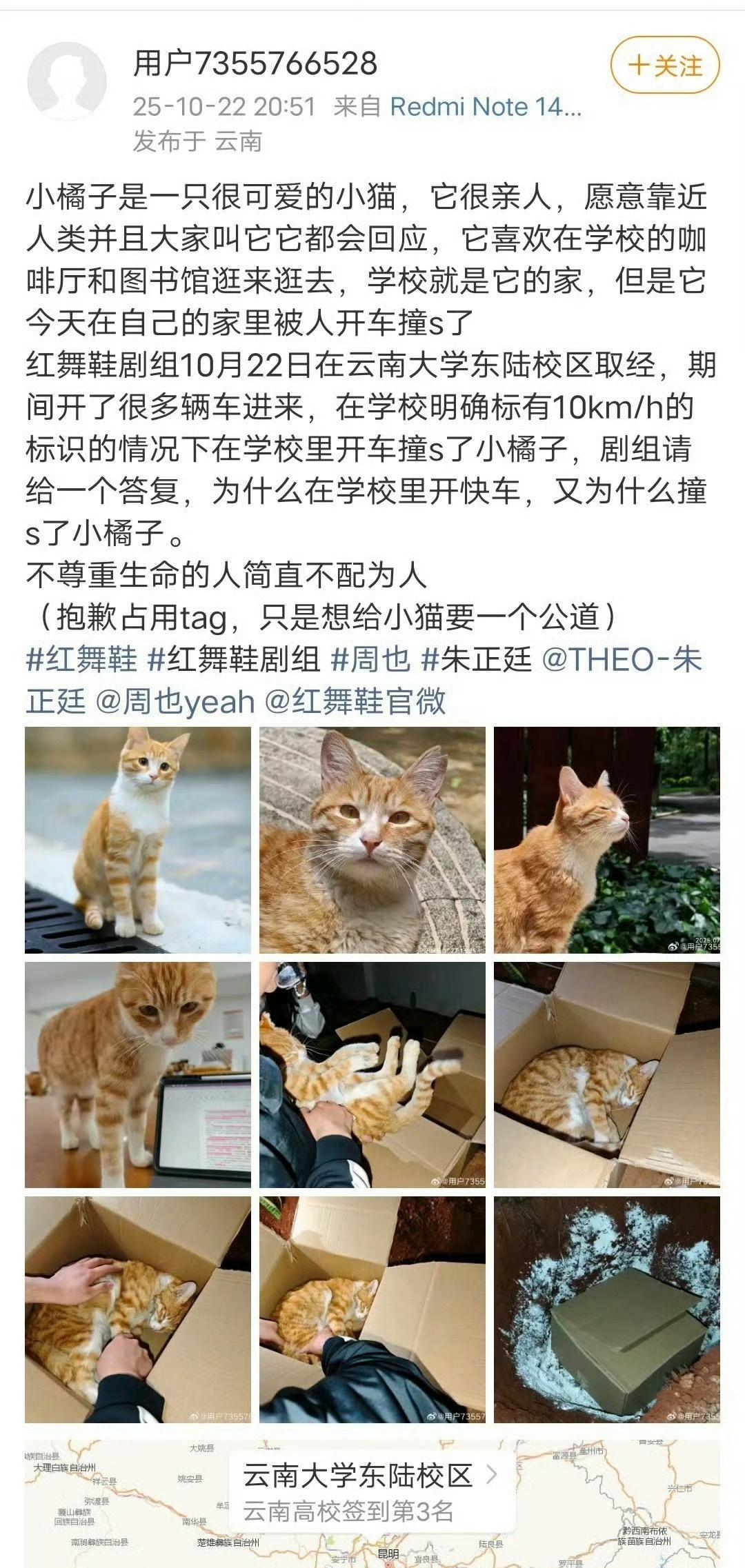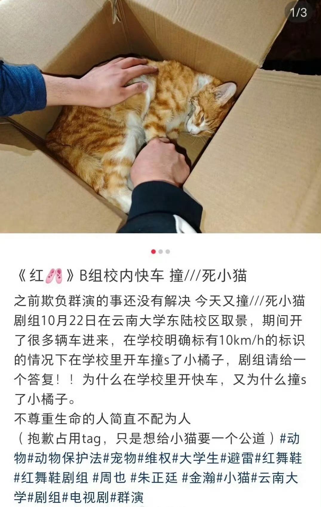 曝红舞鞋剧组开快车撞死猫经反复沟通与确认,10月22日,《红舞鞋》剧组在云南大学取景拍摄期间,剧组司机因疏忽失误,并未发现有小动物在车辆附近,故而发生意外,导致校园内流浪猫小橘子不幸离世。曝红舞鞋剧组开快车撞死猫