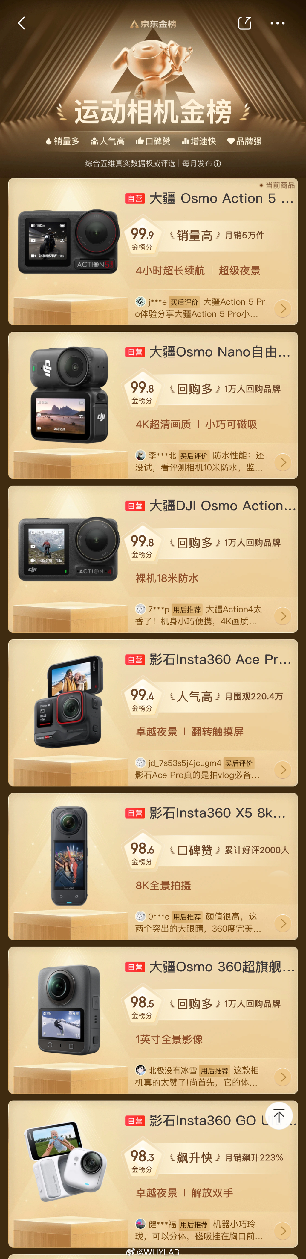 大疆 Osmo 系列在这个双十一卖的真不错,直接霸榜了京东运动相机金榜,前三名分别是 Action 5 Pro、Nano 和 Action 4,早买早享受,晚买有折扣这句话的含金量还在不断提升![并不简单]