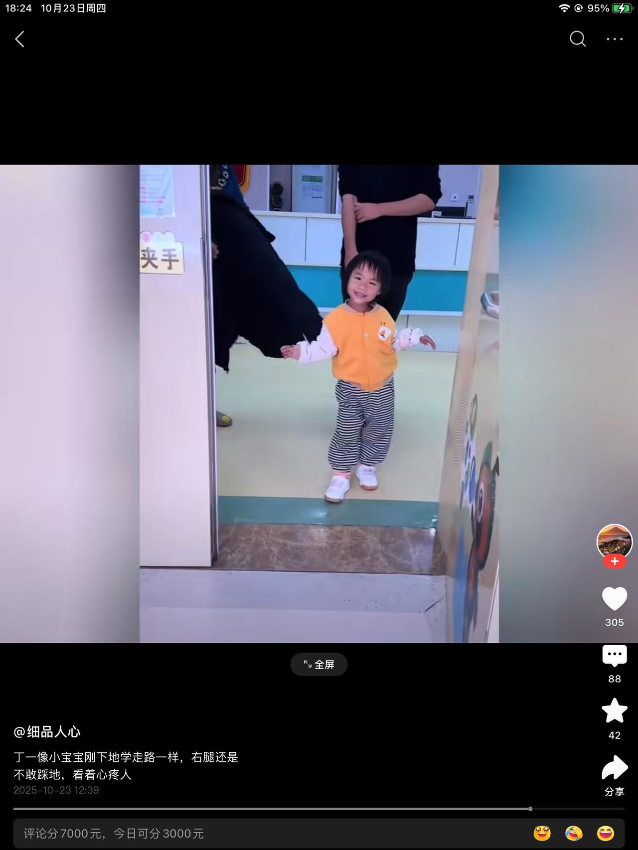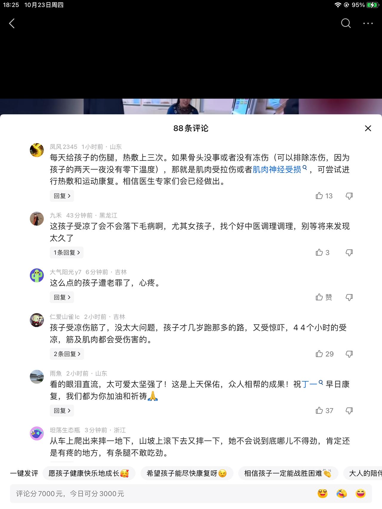 丁一小朋友开始下地走路了,看着好像是右腿,不太敢落地。还好,应该经过治疗和康复以后,慢慢会好起来。这孩子命大。两夜一天,孩子也没吃东西,在那么冷的室外独自生存。 不可谓不是个奇迹。福大命大,以后的福气更大。评论区有说孩子冻着筋了,44小时受凉,筋和肌肉都会不同程度的受伤。这个说法我同意。 还有说热敷的,我觉得不靠谱。有没有中 医生出来说说的,到底咋样才好,才是对的。以前冻伤的都拿雪搓。有没有知道的?