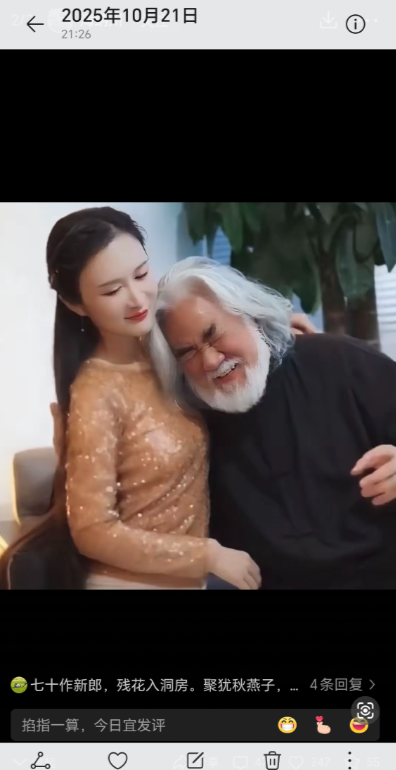 快瞧瞧: 张纪中大导演在小娇妻杜星霖怀里撒上娇啦! 谁说只有女人可以在男人怀里撒娇的! 张大导演用自己撒娇的行动表明: 撒娇不是女人的专利! 当下,男女平等,女士能撒娇,男士同样可以撒娇;而且,不但小女人可以撒娇,老男人同样可以! 这不,张纪中大导演的娇撒得可欢了。 你看他,把个滿是白头发、白胡子的脑袋瓜子,直往少妻杜星霖的怀里钻,脸上激动得红扑扑的,两只眼睛笑得眯成了一条缝,这粘乎劲,要多甜蜜有多甜蜜。 看得年轻人都不好意思了!