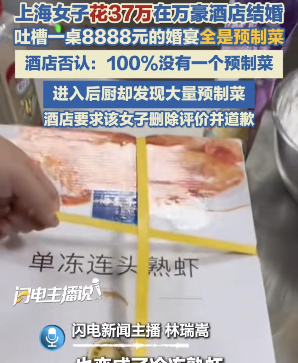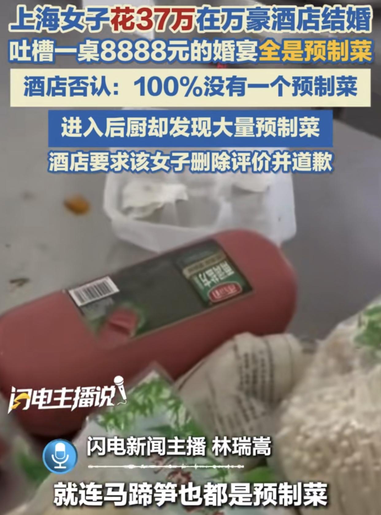 上海一女子花了近40万在某五星级酒店订了婚宴酒席,每桌的标准是8888!却被当天吃席的宾客吐槽说,菜单上的咸猪手、八宝饭,虾马蹄笋,海鲜贝壳,甚至连白切鸡都是预制菜。 于是女子来到该酒店的后厨,这才发现大量的预制菜品,怀疑酒席上的菜品就是预制菜! 而酒店方称,本酒店100%没有预制菜 预制菜时间有长有短,肉丸烧鸡卤菜都是前一天或几天前预制好的,作为一名局外人不在场,没有到后厨看,很难评判。若了解白切鸡,扇贝,大虾的做法,就知道不是预制菜,更不能急冻一年半载,这个只能算半成品。 (来源:荆楚网) 另外,咸猪手,八宝饭这些还需要用辅料和调料加工才能吃,这个猪手需要焯水,烧的时候还要加料酒,只能说是半成品,只是成本低一些。酒店没按现炒的价格给你吃,已经够良心的了。