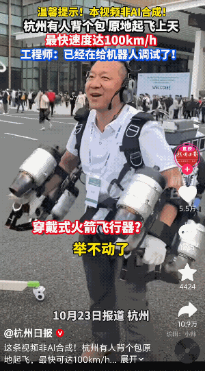 太炫酷了,杭州一波,杠杠的 我们就说杭州这波操作也太绝了!视频里的大叔,背上那套“火箭背包”看着就分量不轻,大叔一边笑着说“举不动了”,一边却把这科幻感拉满的“机器人”玩得有模有样,原地起飞。 据了解呀,这是在杭州一处热闹的户外场地进行的穿戴式火箭飞行器测试,现场那叫一个人山人海,路过的市民们眼睛都看直了,手机举得老高生怕错过一秒。 我们普通人小时候幻想的“飞天梦”,就这么被杭州的工程师们给硬生生变成现实了! 这个大叔喊着“举不动”,但这玩意儿能飙到100km/h,想想都觉得心跳加速呀,感觉太酷了!帅气! 这哪是在调试机器列,这不就是在给我们普通人的个人飞天圆梦呀!真是希望这技术赶紧普及,假设说以后上班堵车?那是不是可以直接背上包飞着去,那叫一个潇洒! 还有网友说,用来跑外卖?真假,这就浪费了吧。 还有网友说:给《美人鱼》里的郑总讲一声,不用喷农药了!真有才呀!这网友。