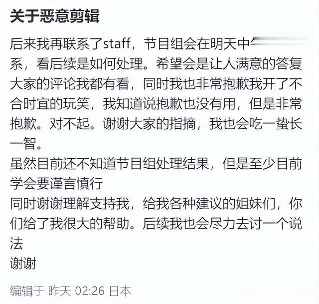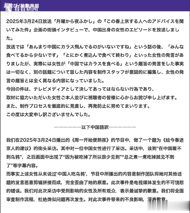27日,该节目组所属日本电视台在官网用中日双语道歉称,这名女生从未说过“中国人吃乌鸦”,制作团队恶意剪辑完全歪曲了她的本意。道歉称,这是电视媒体不可饶恕的错误,对这名女生和所有观众表示最诚挚的道歉,今后将全面审查防止再犯。