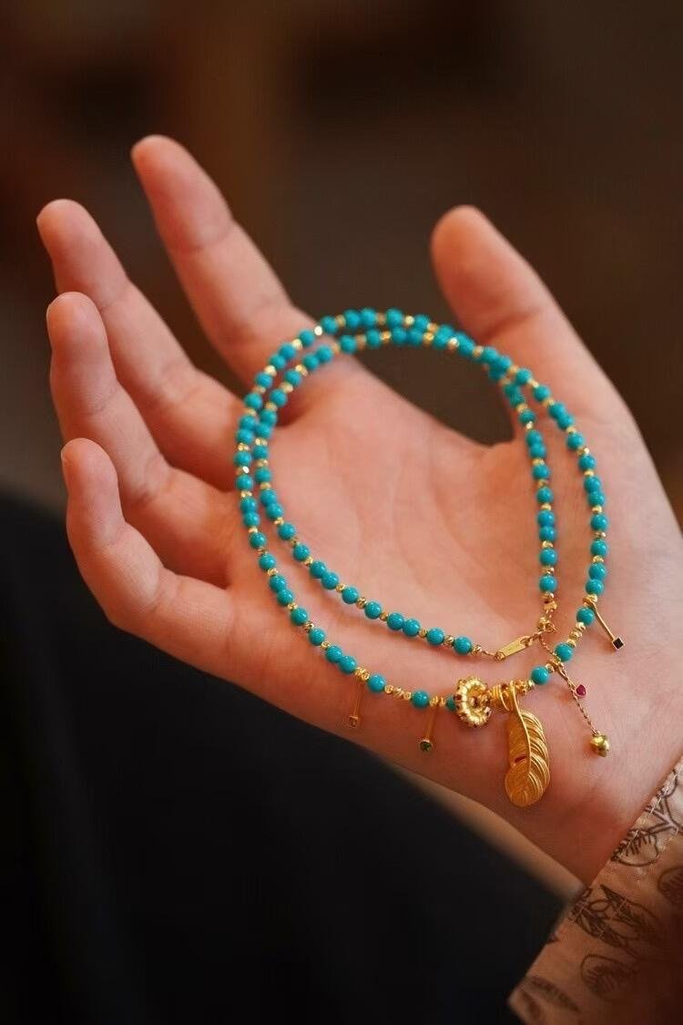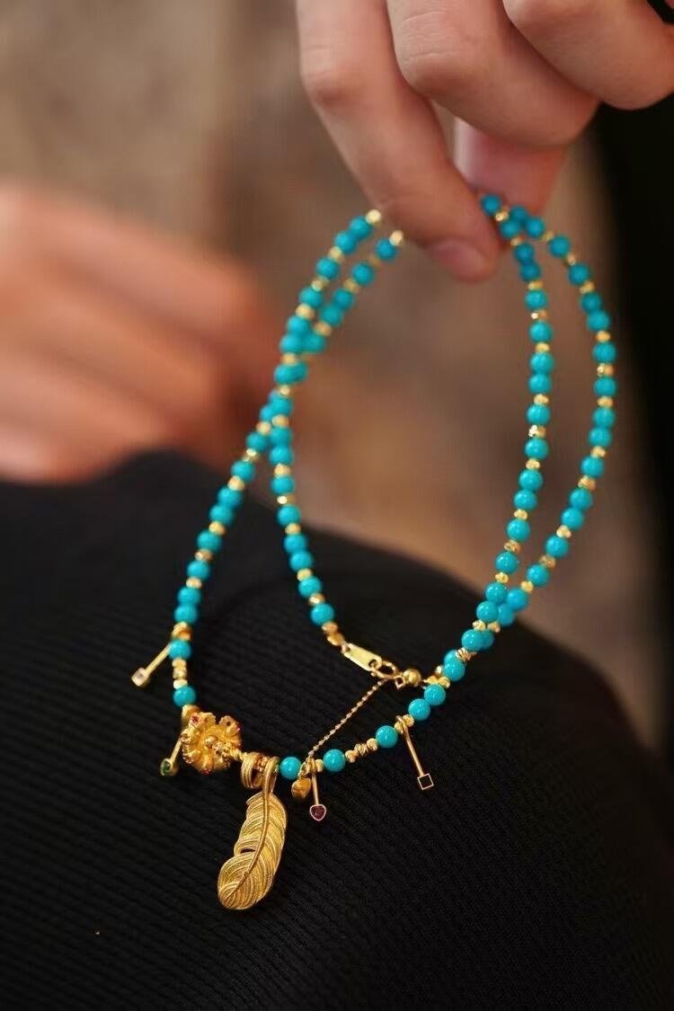 这串绿松石颈链一样就爱上了,清透的绿松石珠子衬着古法金饰,羽毛吊坠带着肌理感,小钻、彩宝挂坠添了抹灵动劲儿。